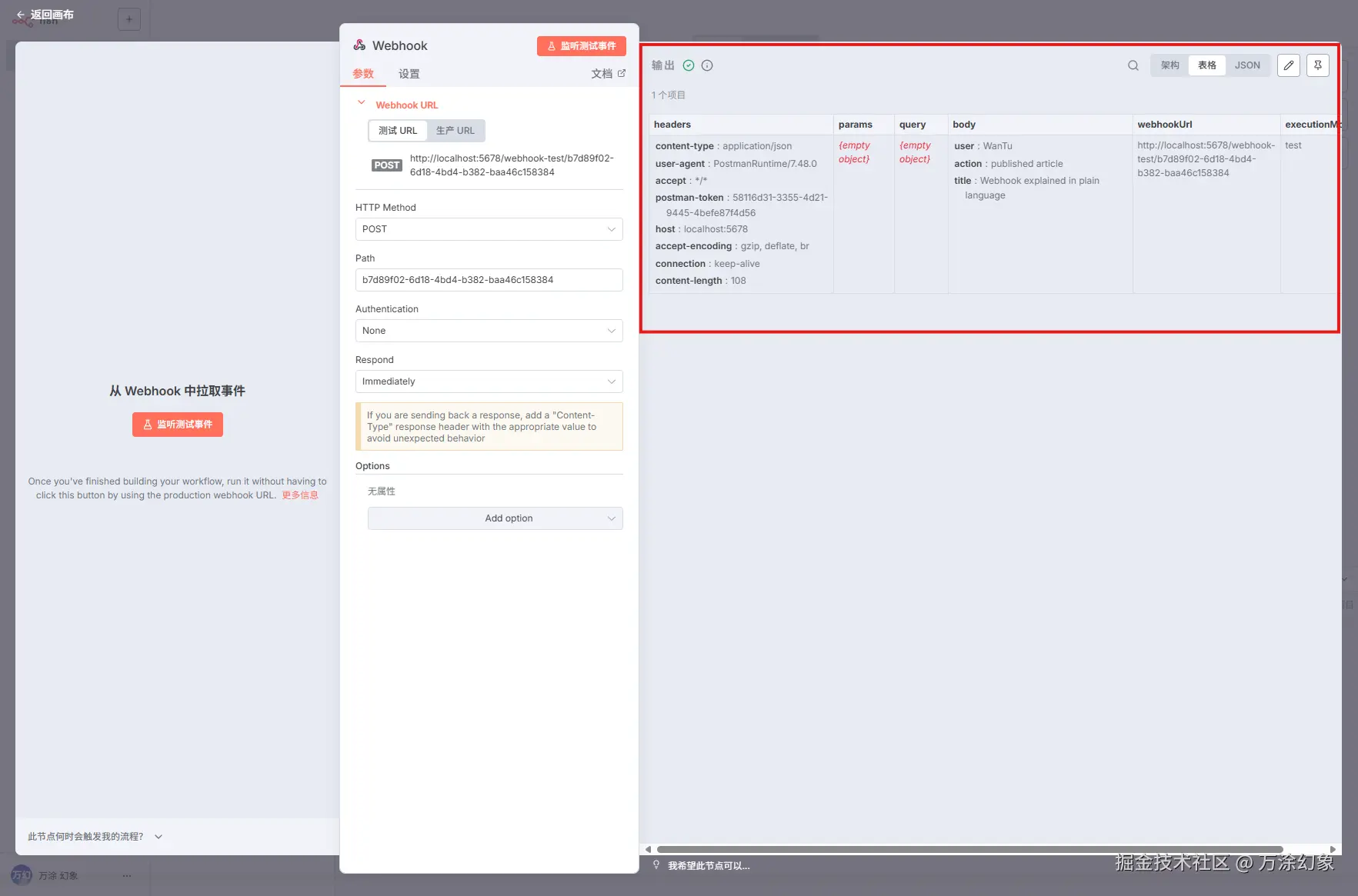 - 发送成功后,你切回 n8n 的界面,会发现 Webhook 节点已经"亮了",并成功捕获到了你从 Postman 发送的数据。