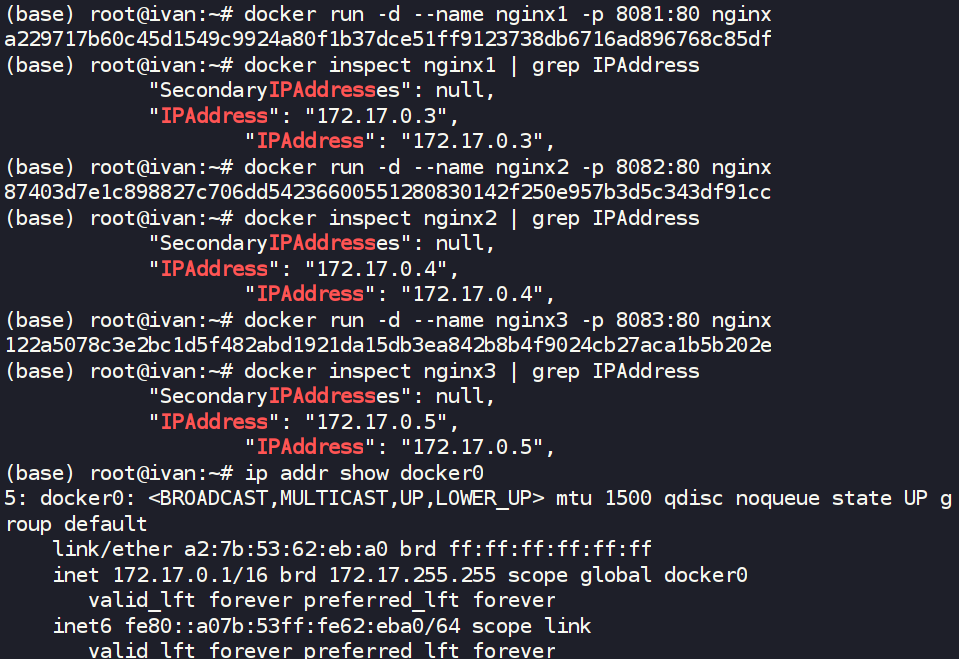 # 1. 启动三个 Nginx 容器,分别映射到宿主机的不同端口