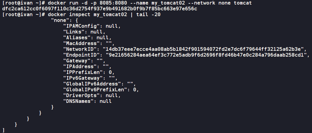 docker run -d -p 8085:8080 --name my_tomcat02 --network none tomcat