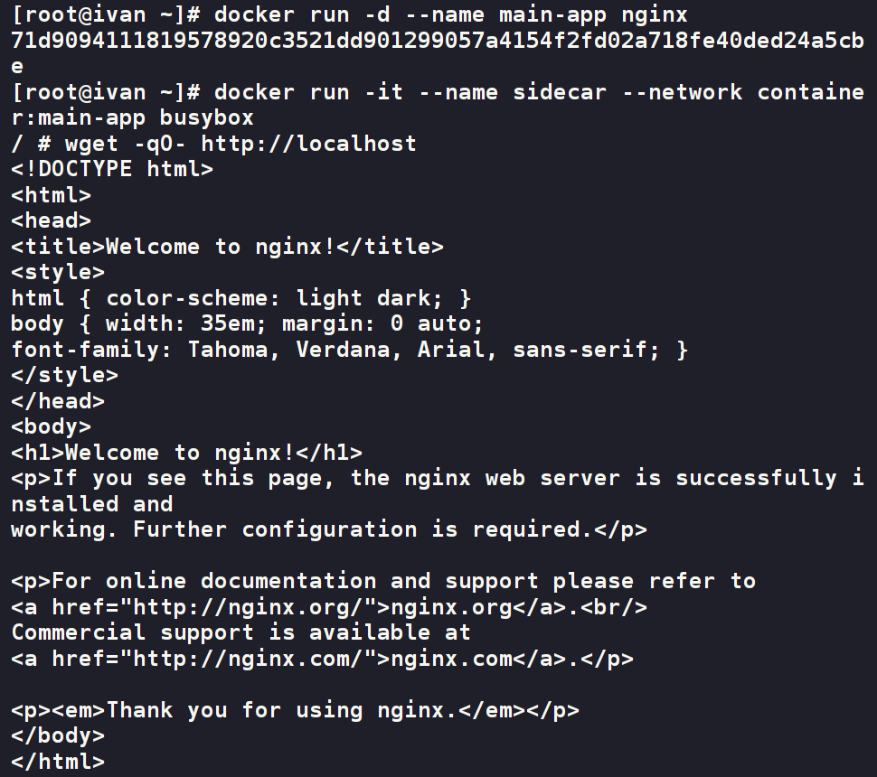# 3. 在 sidecar 容器的 shell 内部,通过 localhost 访问 main-app 的 Nginx 服务