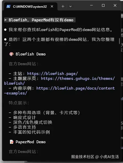 👍 整个过程行云流水,不到5分钟,我就确定了技术方案:使用 Hugo 框架和 Blowfish 主题。