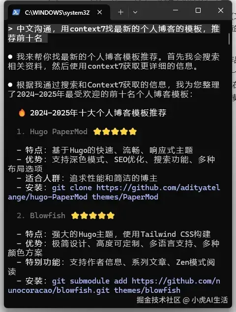 瞬间,AI就给了我一份精准的清单,列出了当前最流行、最受好评的博客模板。