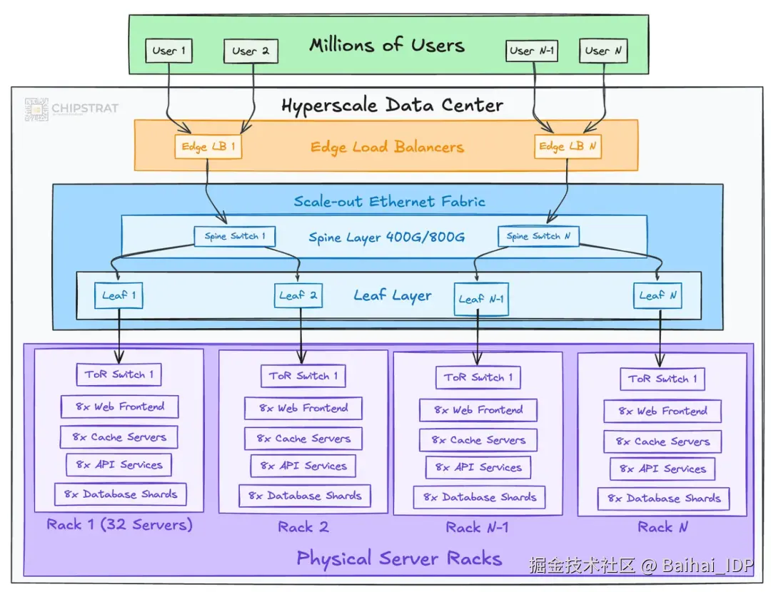 超大规模数据中心专为将单一服务扩展至数百万乃至数十亿用户而构建,例如 Gmail、YouTube、Netflix 或亚马逊电商。成千上万台服务器各司其职,共同构成一个庞大的分布式系统。