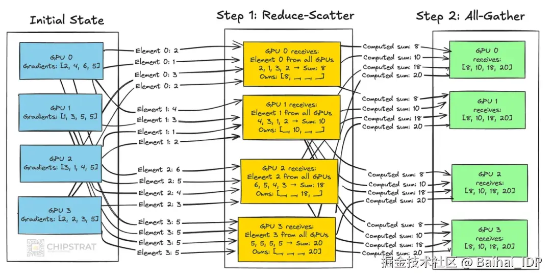 梯度聚合(全规约) -- 在每个 GPU 计算出自己的调整量(梯度)之后,它们会互相比较并取平均值,确保所有 GPU 获得统一的模型更新指令。这一过程需要 GPU 之间进行大量的双向通信!