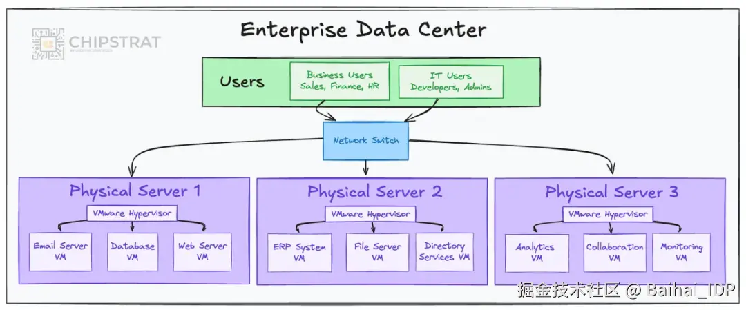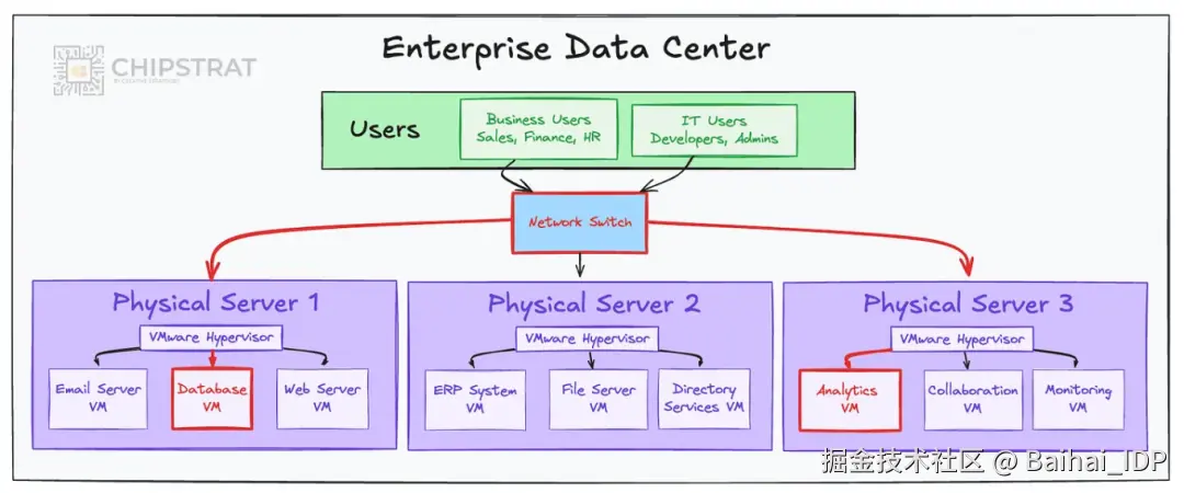 企业网络需同时运行多种业务应用:如邮件服务器、数据库、ERP、CRM、分析工具等。这些工作负载通常运行在搭载多个虚拟机的高性能多核服务器上,每个虚拟机隔离执行独立任务。