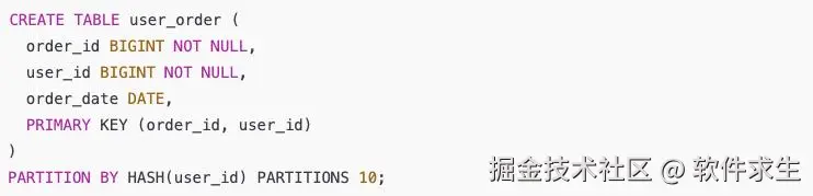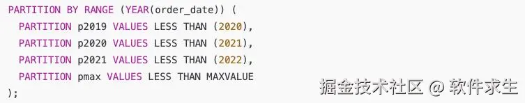 其实在 MySQL 5.7 就已经支持 Partition Table 功能了,但 8.x 做了更多优化。语法长这样: