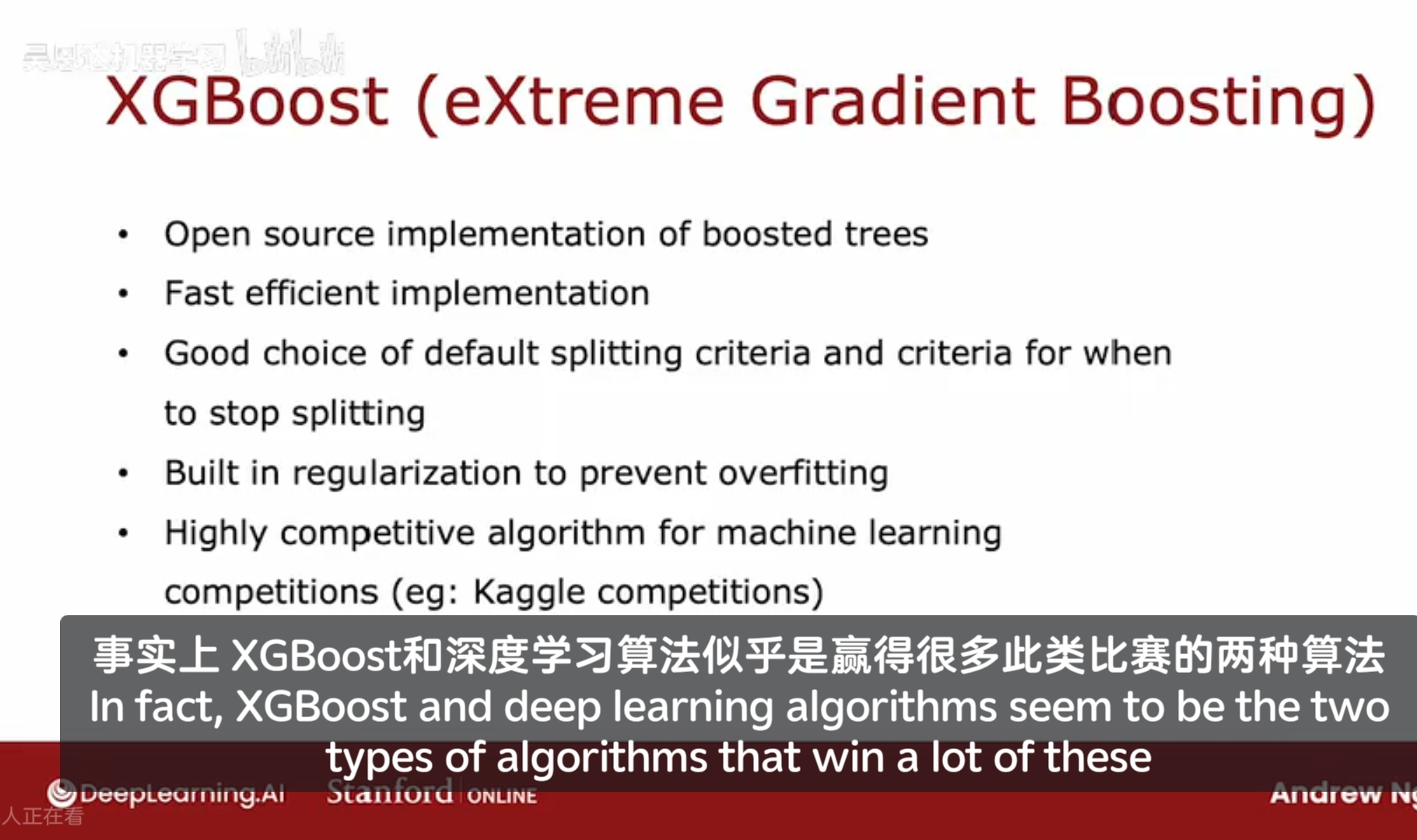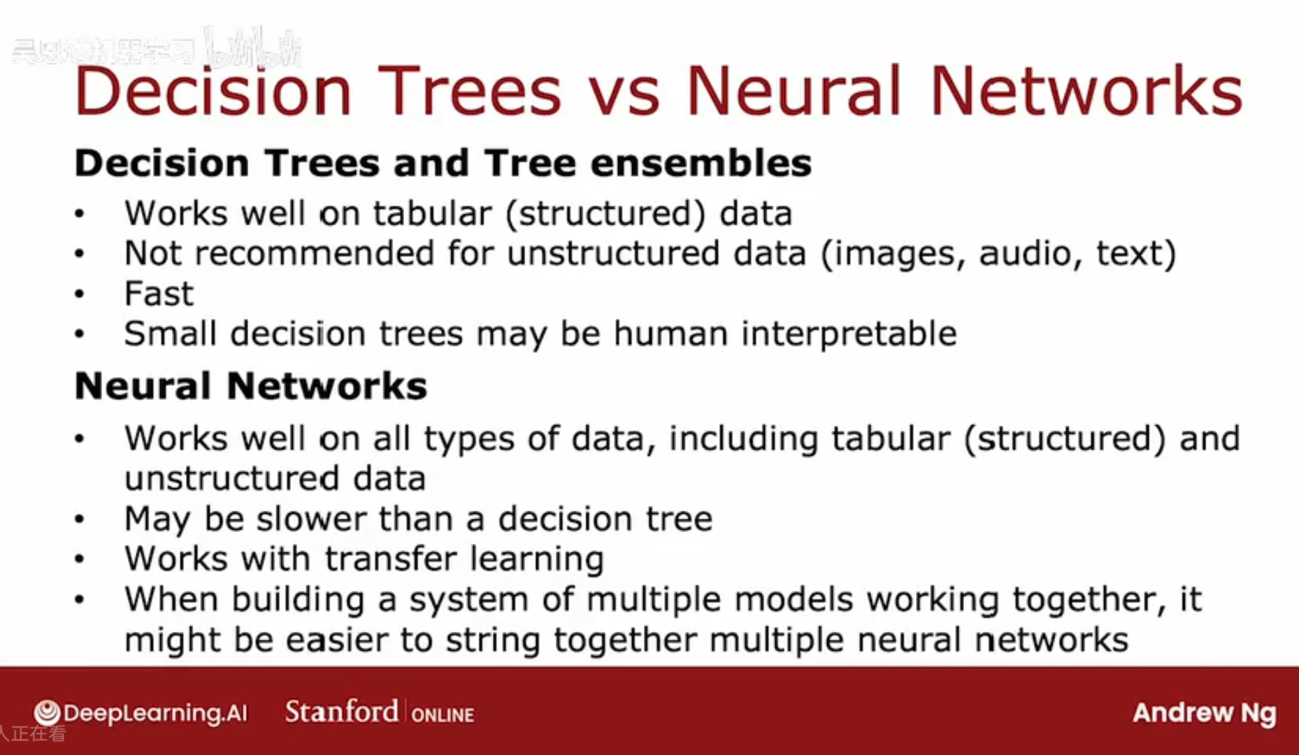 并不推荐在非结构化数据上使用决策树,比如图片,音频,文本(不以电子表格形式存储的)。