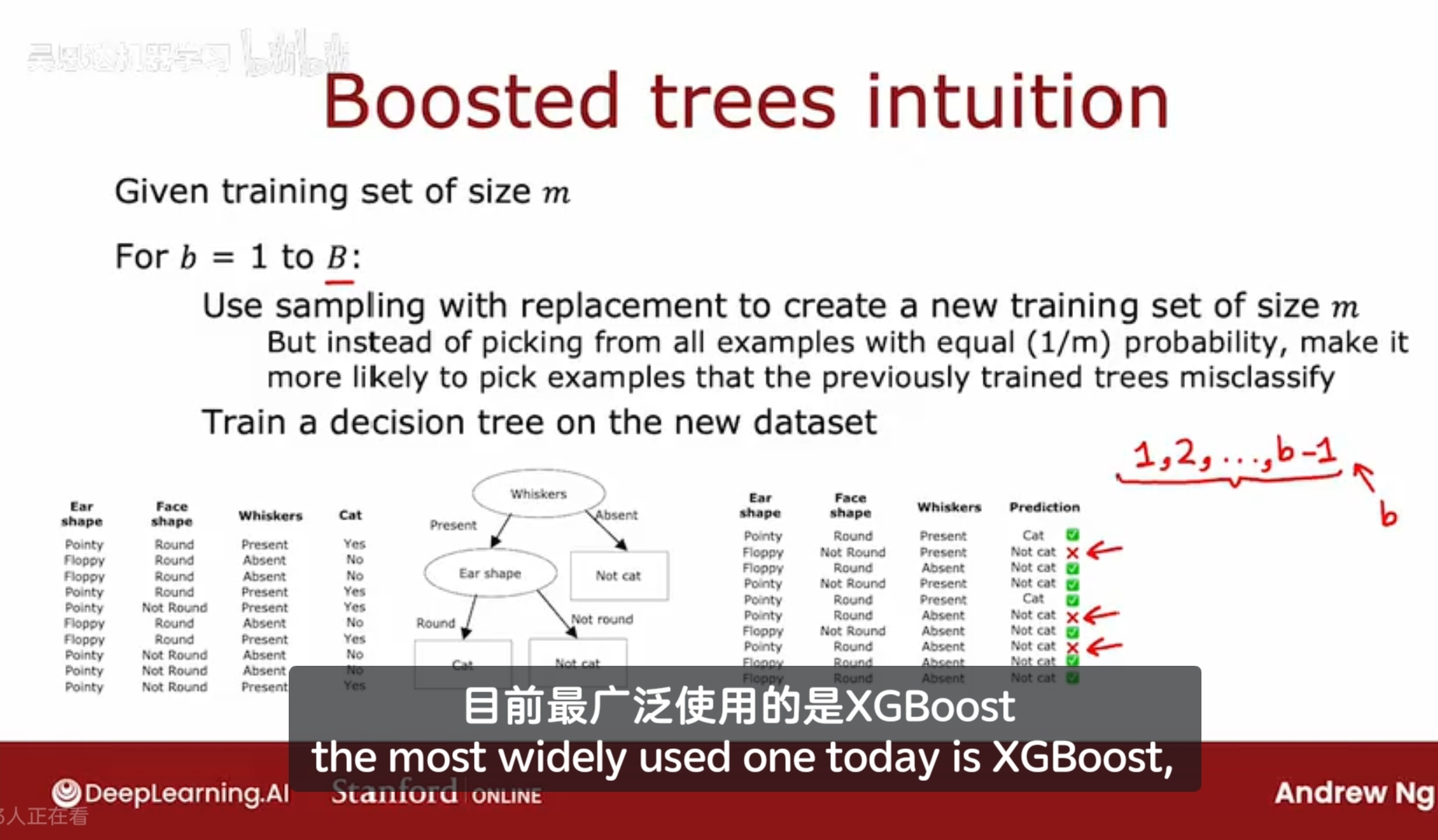 在第二次循环中,使用有放回抽样来重新生成训练集,每次选取样本时,那些被错误分类的样本有更大的概率会被选中,这会让第二棵树以类似于刻意练习的方式关注这些被分类错误的样本示例。