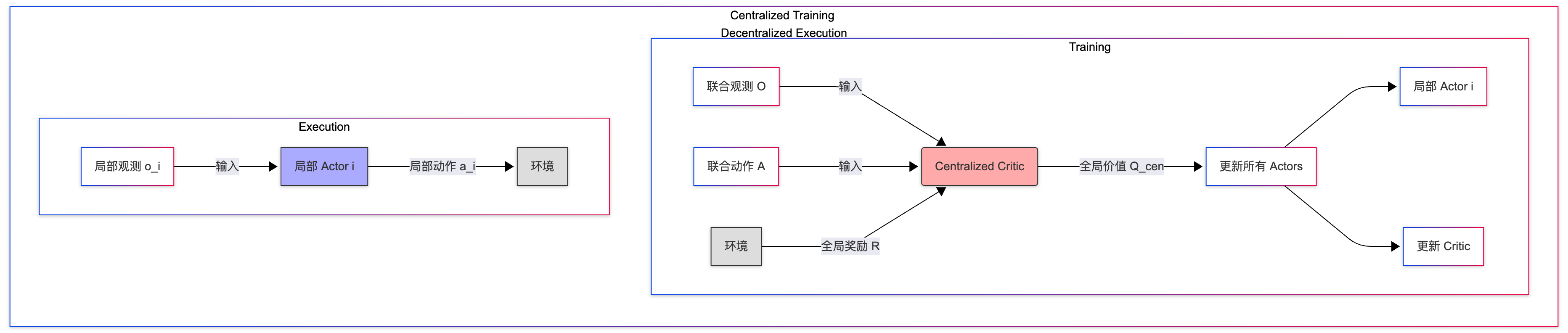 CTDE | 全局(集中) | 局部(分散) | 兼顾高性能和实际部署要求 | QMIX, MAPPO, MADDPG |