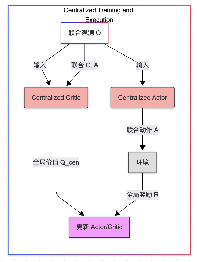 # 这意味着 Actor_i 的梯度是通过中央 Critic 传导的