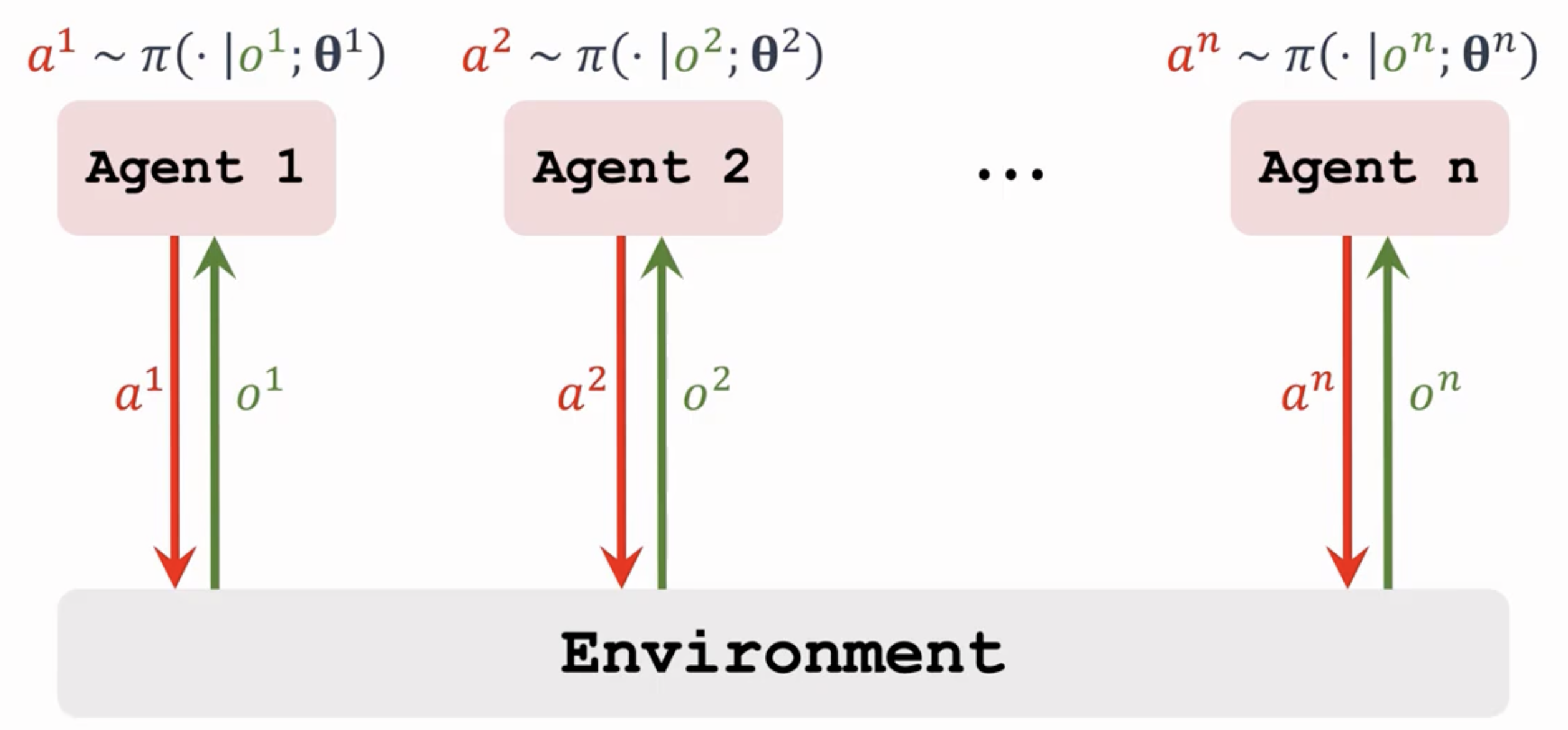 - 环境是非静态 的(Non-Stationary)。每个智能体的最优策略 不仅取决于环境的内在特性,还取决于其他所有智能体的策略和动作。