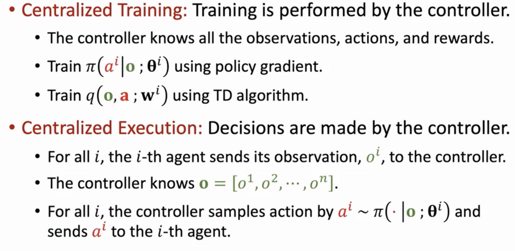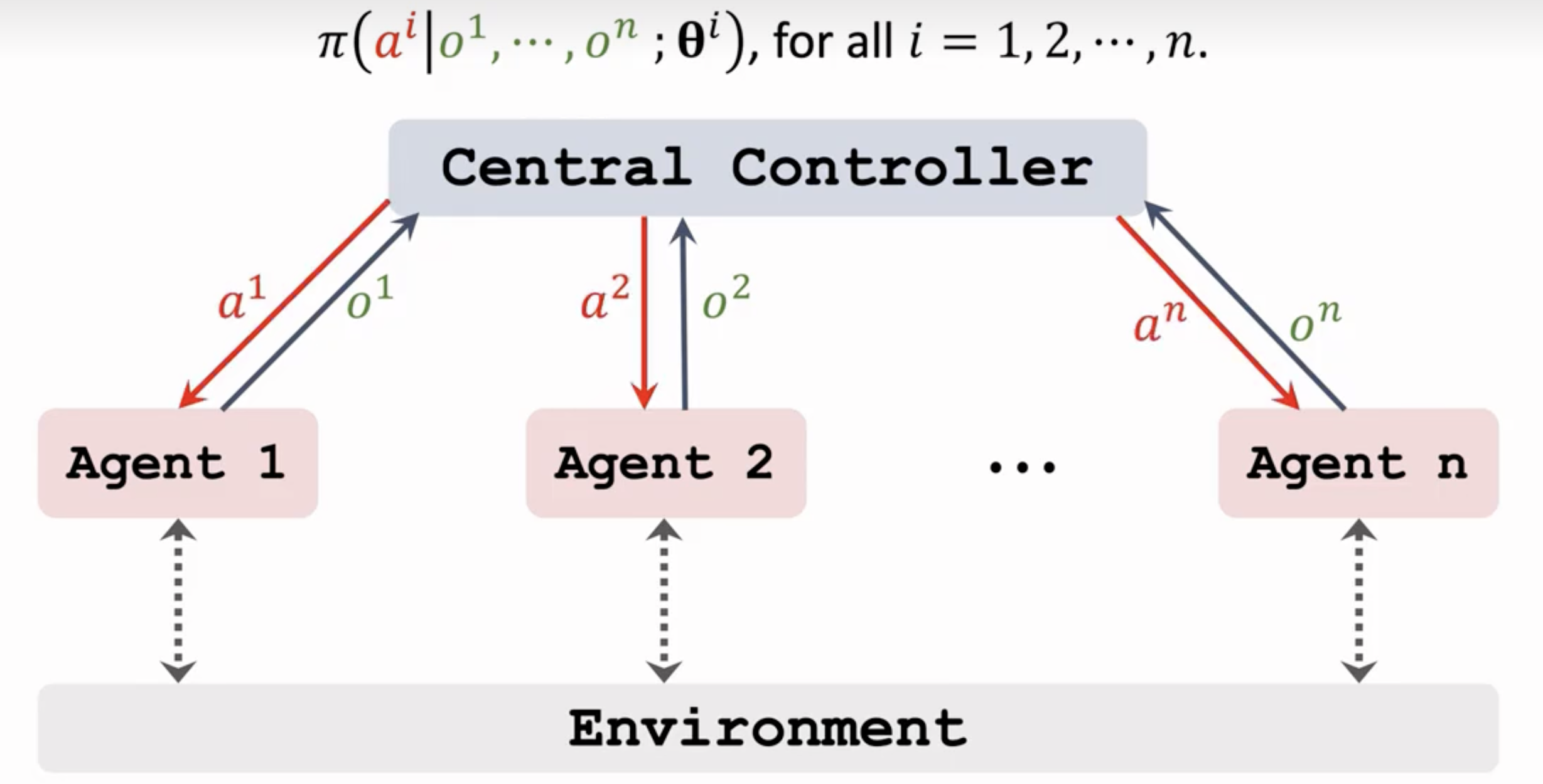 训练和执行 过程中,存在一个中央控制器(Central Controller) ,它可以访问所有智能体的观察、状态和动作,并进行全局决策