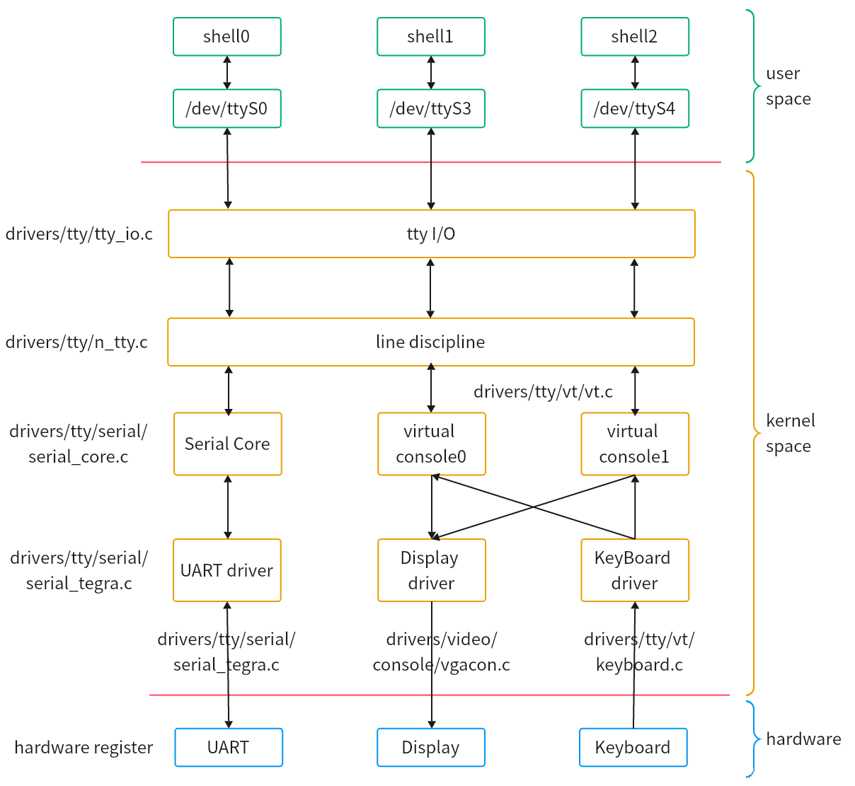 串口驱动隶属于linux tty驱动框架的一部分, 其整体框架可参考下图,方便有个直观印象。