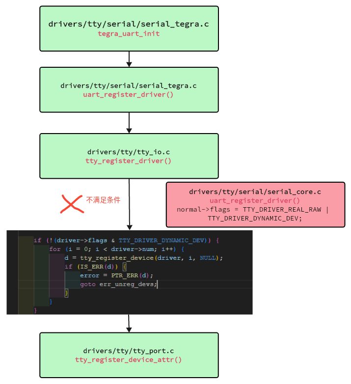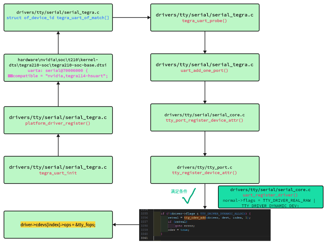 tty_port.c---tty_port_register_device_attr则是在串口核心层uart_add_one_port中调用,层层追溯至硬件驱动层的tegra_uart_probe()函数中,该函数是在platform驱动框架下匹配设备树后执行。