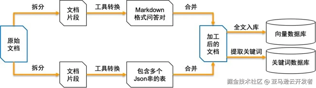 根据经验,将数据按照不同组织形式进行针对性处理,会有效提高知识库问答准确率。数据预处理这一步骤主要的作用是将原始文档按照不同文本形式拆分并转换后,再合并成新的处理后的文档,之后将其内容注入向量数据库,并提取关键词注入关键词数据库,如下图所示: