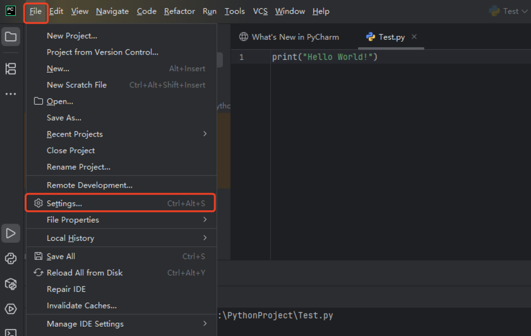 打开 PyCharm 软件,点击 File - Settings