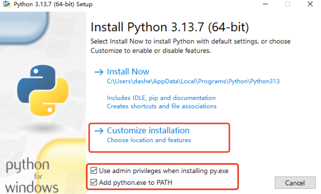 同时勾选Add python.exe to PATH(自动配置环境变量,这个步骤非常重要,可以省掉很多麻烦),如下图