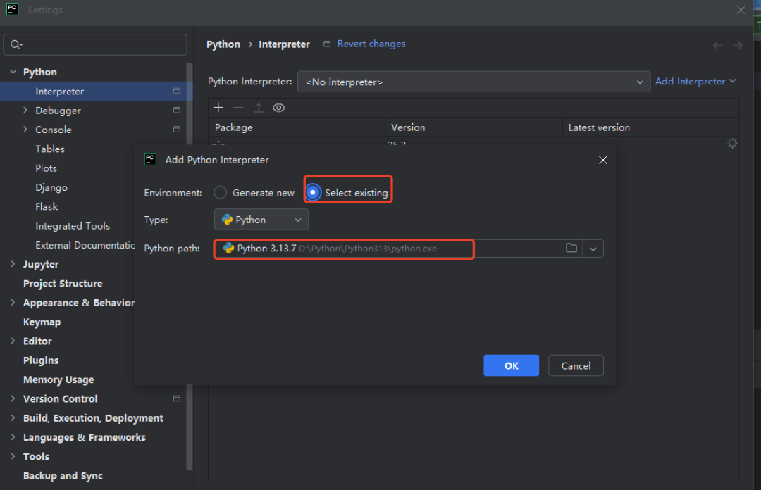 弹出框,选择 :Select existing,选择刚刚安装好的 D 盘目录 python ,这样子 PyCharm 就配置好了。