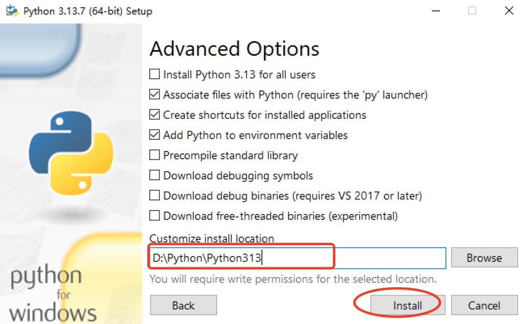 我们选择 D 盘的文件夹,比如:D:\Python\Python313,其他选项我们保持不动,然后点击 Install 。