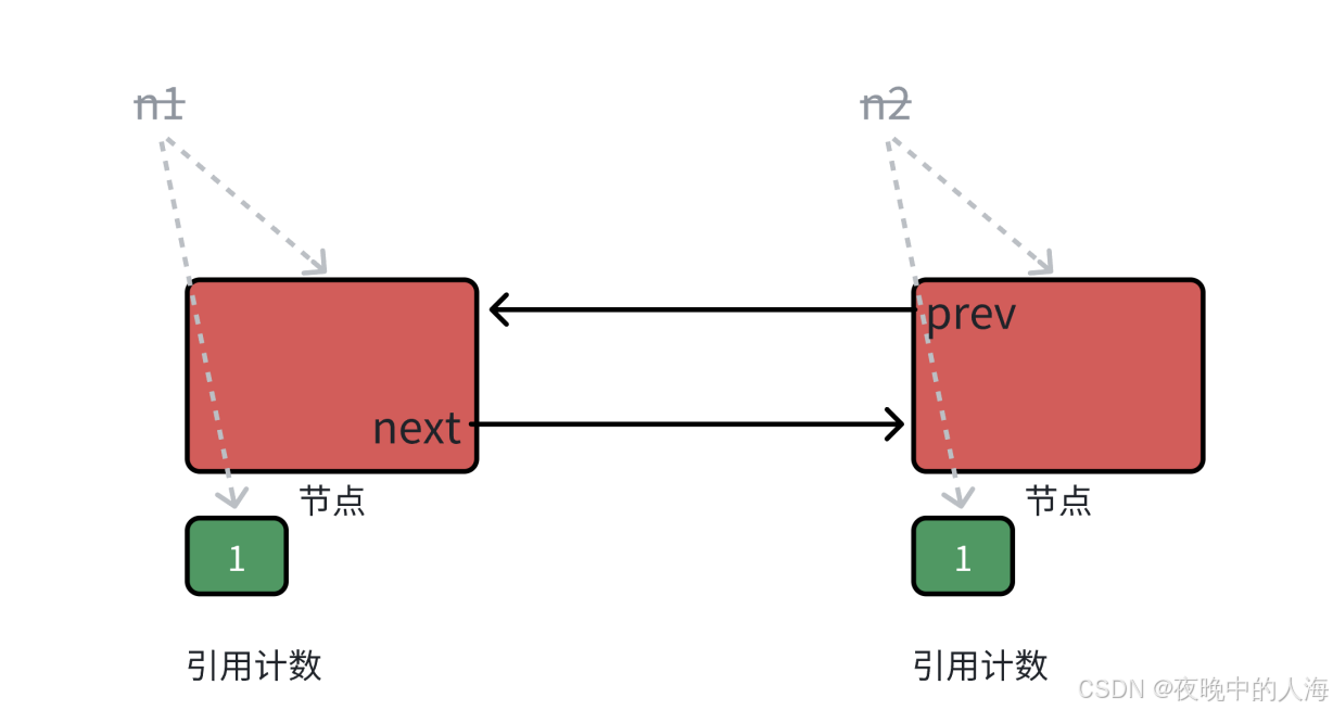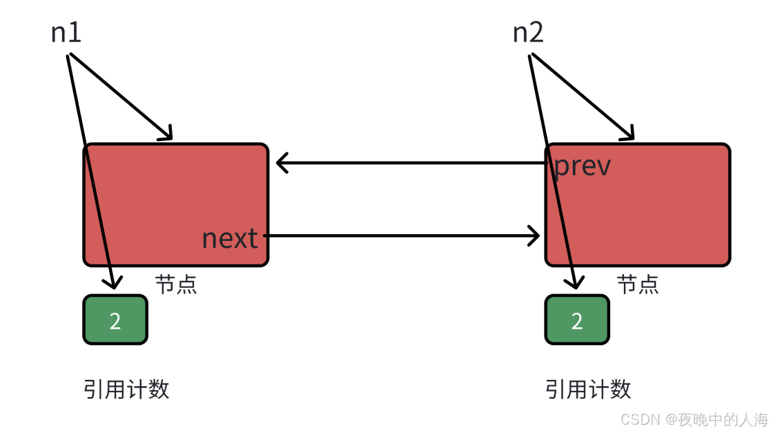 当n1和n2进行析构时,引用计数为1不为0,导致内存泄漏