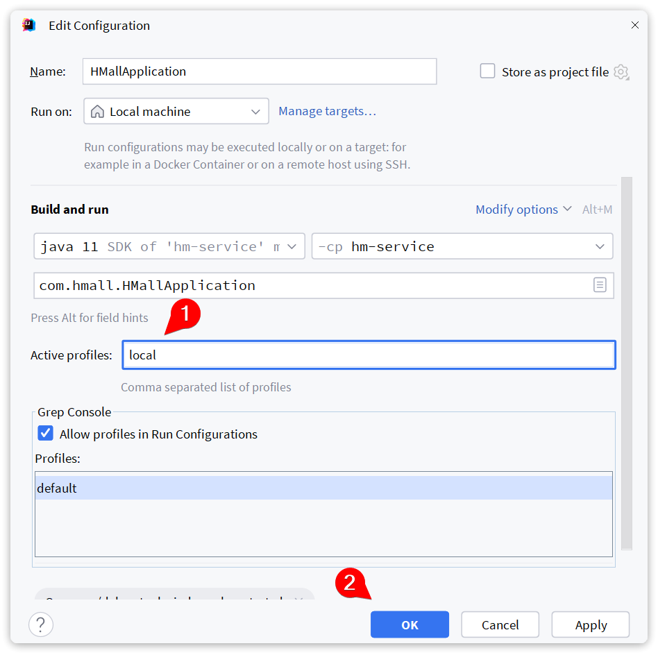 在弹出窗口中配置SpringBoot的启动环境为local: