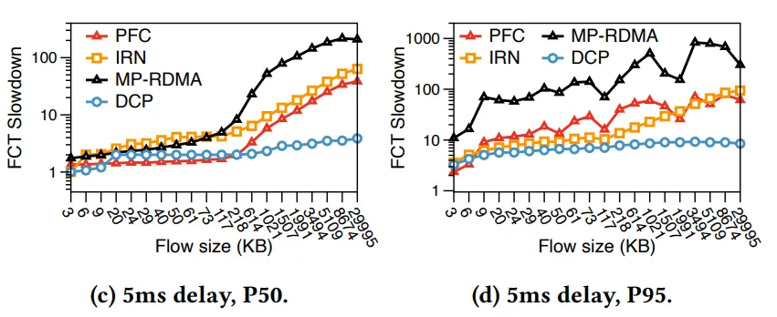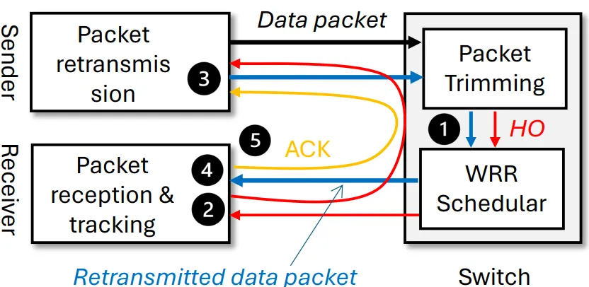 SIGCOMM'25\] Revisiting RDMA Reliability for Lossy Fabrics [https://mp.weixin.qq.com/s/_4bhHZj8vigXn1mfM7abkQ](https://mp.weixin.qq.com/s/_4bhHZj8vigXn1mfM7abkQ "https://mp.weixin.qq.com/s/_4bhHZj8vigXn1mfM7abkQ") ## **一、背景:算力激增驱动智算网络规模不断增大,现有传输技术面临挑战** AI大模型快速发展,算力需求急速攀升,驱动集群网络组网规模不断扩大,通信距离也不断拉远。单一集群需要园区内多栋楼部署,同时受到部署策略、走线等物理因素限制,最大通信距离可达到2km-10km;如果要规划更高的算力规模,供电、散热等能源问题会成为瓶颈,需要多集群联合训练,跨AZ场景最大通信距离可达到百公里。 当前智算网络大多沿用已有数据中心技术,主要的技术路线是基于PFC流控的无损RDMA网络。但随着组网规模的进一步增大,PFC带来的头阻、死锁、运维等问题会更凸显,严重影响网络性能。另外,在交换机交换容量增大、交换芯片Buffer增长速度滞后等趋势下,该路线将会面临Buffer不足的问题。与此同时,业界也一直在探索高效的有损RDMA路线,例如在RDMA网卡(RNIC)中实现选择性重传机制。然而这条路线仍然面临ECMP冲突、RTO超时等问题,并且对多路径、逐包均衡等技术兼容性不好。 **针对上述问题,文章提出了DCP(Data Control Partitioning)数控分离技术,重构了高速有损网络的RDMA可靠性设计,推动智算网络向容损、逐包均衡等方向演进。**该方案对控制信息和数据信息采用不同传输策略,对数据信息允许有损传输,对控制信息采用无损传输,可以大大降低对Buffer的依赖,彻底消除PFC带来的头阻、死锁等问题,同时兼容多路径传输、逐包均衡等技术,支持百万卡规模、百公里等大规模、长距离、高性能网络传输的需求。 ## **二、DCP设计思路** DCP是一种联合设计交换机和RNIC的传输架构,包含DCP-Switch和DCP-RNIC。DCP概念上定义了数据平面(DP)用于有效载荷传输和控制平面(CP)用于报文头部传输。与无损RDMA网络通过PFC同时保证DP和CP的无损性不同,DCP-Switch引入Packet Trimming功能,每当网络出现丢包时,会把丢失报文的头部封装成Header-Only(HO)报文传输给接收端;DCP-Switch使用加权轮询(WRR)调度器来优先处理控制队列,从而确保控制平面(CP)传输的无损性,同时允许数据平面(DP)以有损方式运行。  同时,DCP-RNIC利用无损控制平面的特性来增强RNIC的可靠性,实现了以下几项关键功能: * Precise and Fast HO-based Retransmission:发送方根据HO包携带的PSN精确并高效地重传丢失的包; * Order-tolerant Packet Reception:接收端RNIC可以直接将任何包(无论是有序还是乱序)写入其相应的应用程序内存地址,消除了对重排序缓冲区的需求; * Bitmap-free Packet Tracking:DCP-RNIC利用无损CP的"Exactly Once"特性,消除了包级别bitmap的需求,采用包计数来跟踪聚合的消息级信息,显著减少了内存开销和处理周期。 ## **三、实验效果** 文章针对DCP进行了全面的技术验证,主要包括两部分:1)原型样机测试(含DCP-Swtich和DCP-RNIC);2)大规模仿真实验。  **原型样机测试结果:**组网拓扑如上图所示,DCP传输技术与逐包负载均衡原生适配,相较于Mellanox RNIC,DCP在丢包恢复效率上提高了1.6×∼72×,在AI工作负载的完成时间上降低了42%;相较于IRN和MP-RDMA,DCP在通用负载测试上分别取得了2.1×和1.6×的性能提升。此外, DCP在10公里长距测试下实现了接近理想的高吞吐,DCP理论上可实现百公里高性能传输。   **仿真实验结果:**组网拓扑如上图所示,DCP传输技术相较于MP-RDMA和IRN(业界SOTA的lossless和lossy传输解决方案),在智算流量场景(如AllReduce)下,平均降低了38%和45%的任务完成时间JCT(如下图a所示);在通算流量场景下,分别降低了16%和10%的P95尾部流完成时间FCT。此外,在1000公里长距大规模实验中,相较于MP-RDMA和IRN方案,DCP分别降低了95%和51%的P95尾部完成时间(如下图d所示)。  ## **四、总结** 华为网络技术实验室提出的DCP技术,是一种面向有损网络的高性能RDMA传输架构,通过将轻量级无损控制平面与硬件高效的RNIC设计相结合,消除了对PFC的依赖,支持包级负载均衡,并避免了RTO。原型和仿真表明,DCP 的性能显著优于现有的 RDMA 解决方案,有利于推进高性能 RDMA 传输技术在有损网络中的应用。 经了解,华为网络技术实验室在研究面向AI原生的传输技术AI-Native Transport(ANT),通过逐包均衡/多路径、算效优先调度、容损传输等技术,为AI智算网络提供高吞吐、高算效、高可扩展的传输能力,本次SIGCOMM文章的DCP技术是ANT若干特性之一。