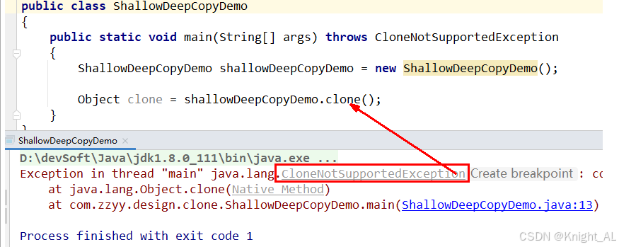 方法时会抛出异常。 - 需要实现 Cloneable 接口后,才能正常调用