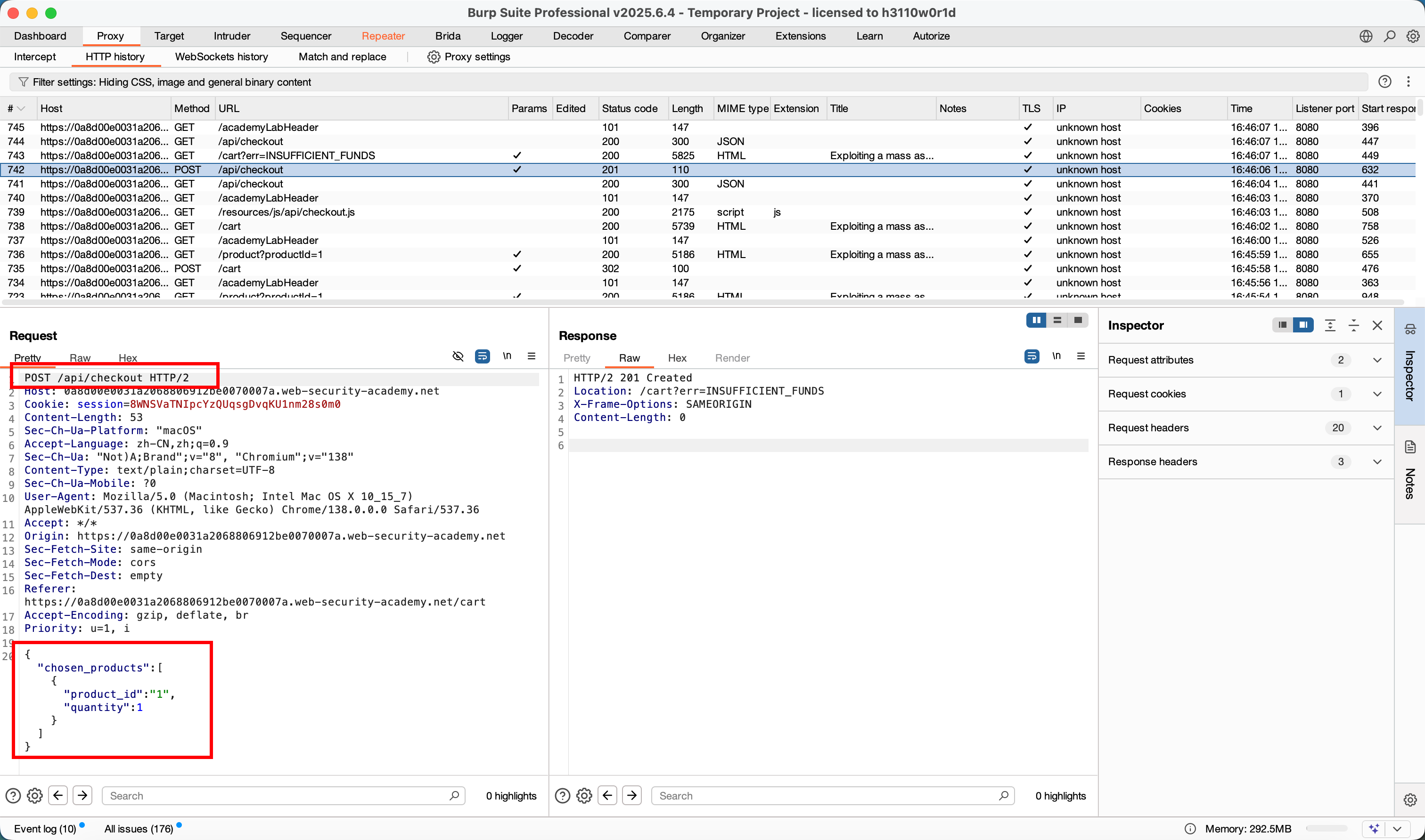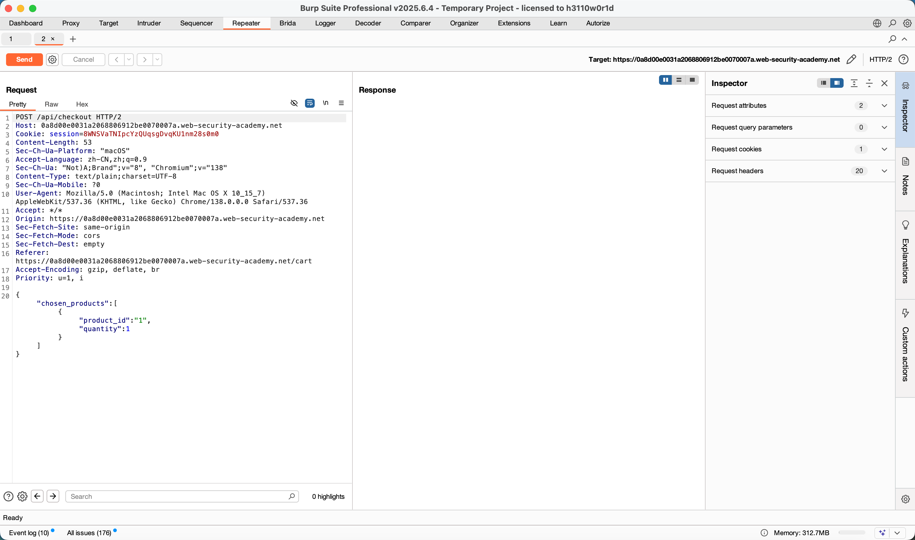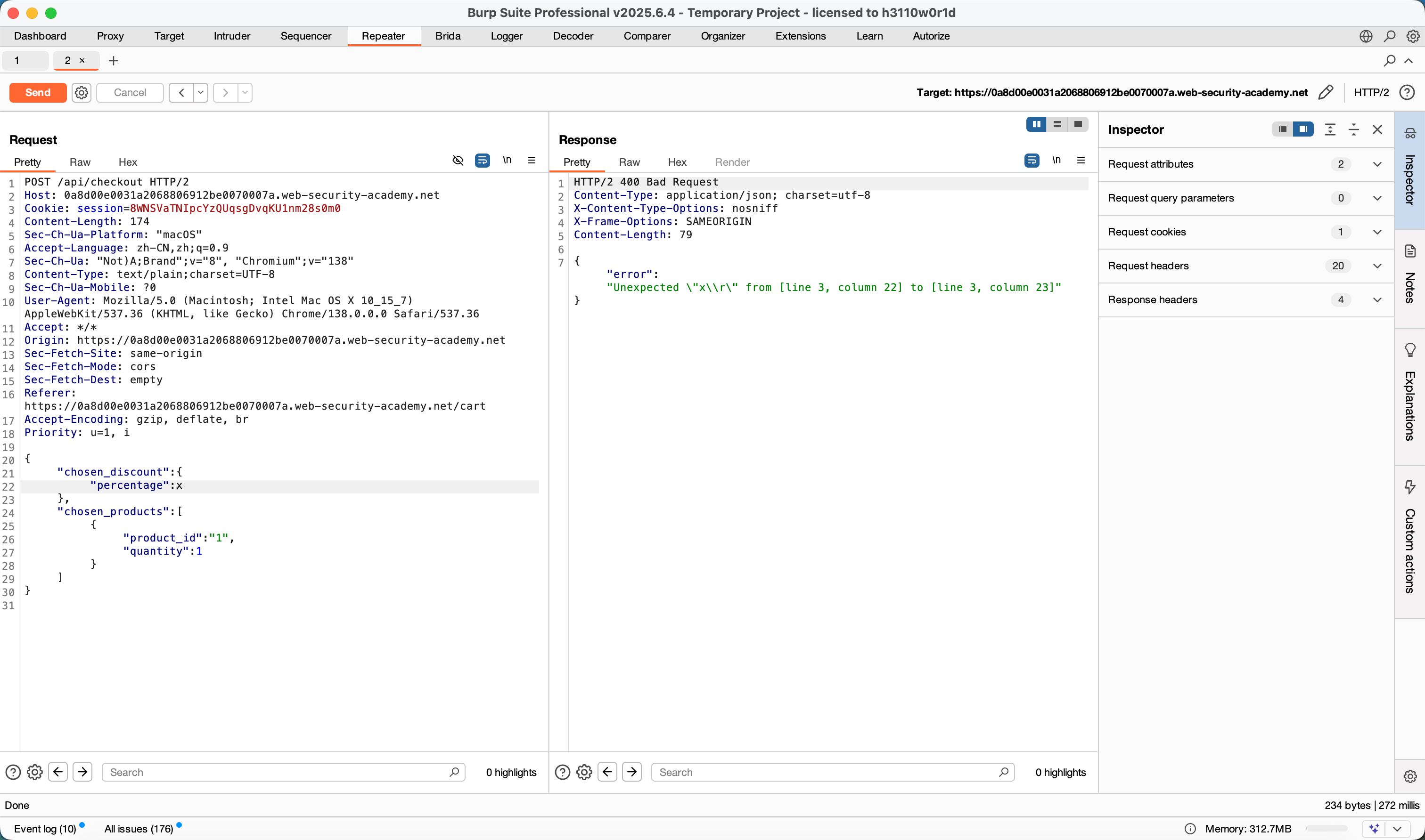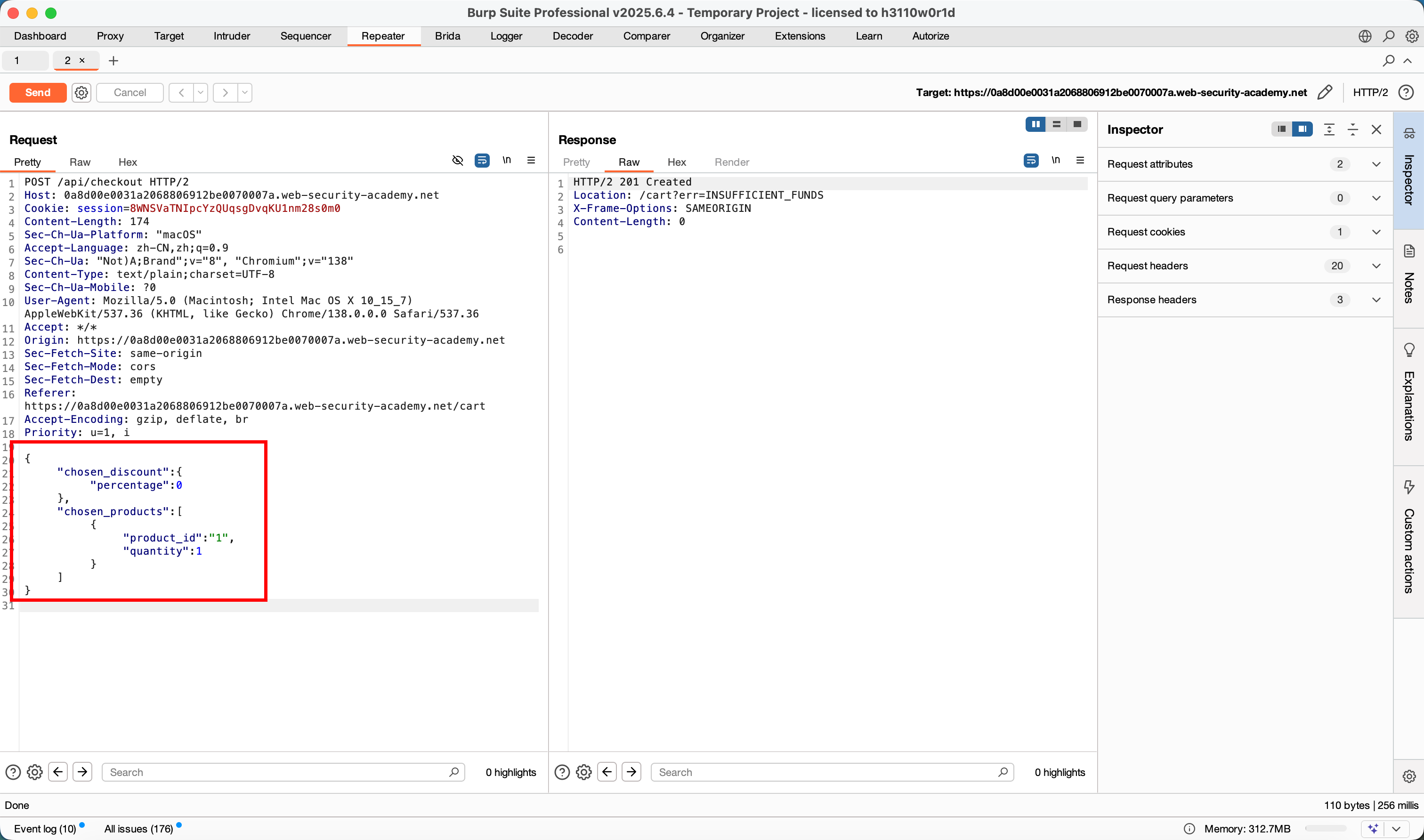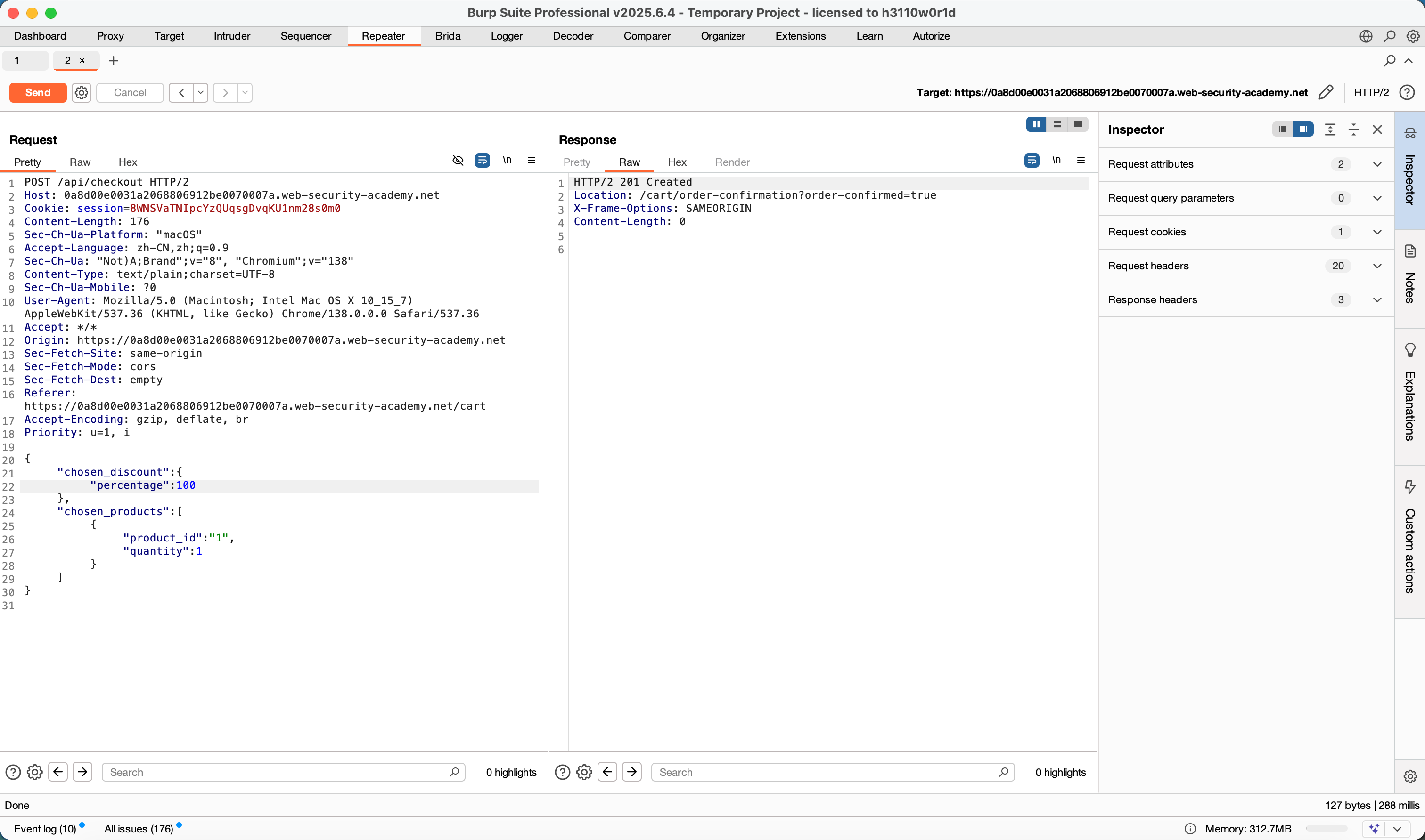 点击 "Send" 发送这个最终的请求。由于应用了 100% 的折扣,总价变为 0,你的信用额度就足够了。订单成功提交,实验也就解决了!