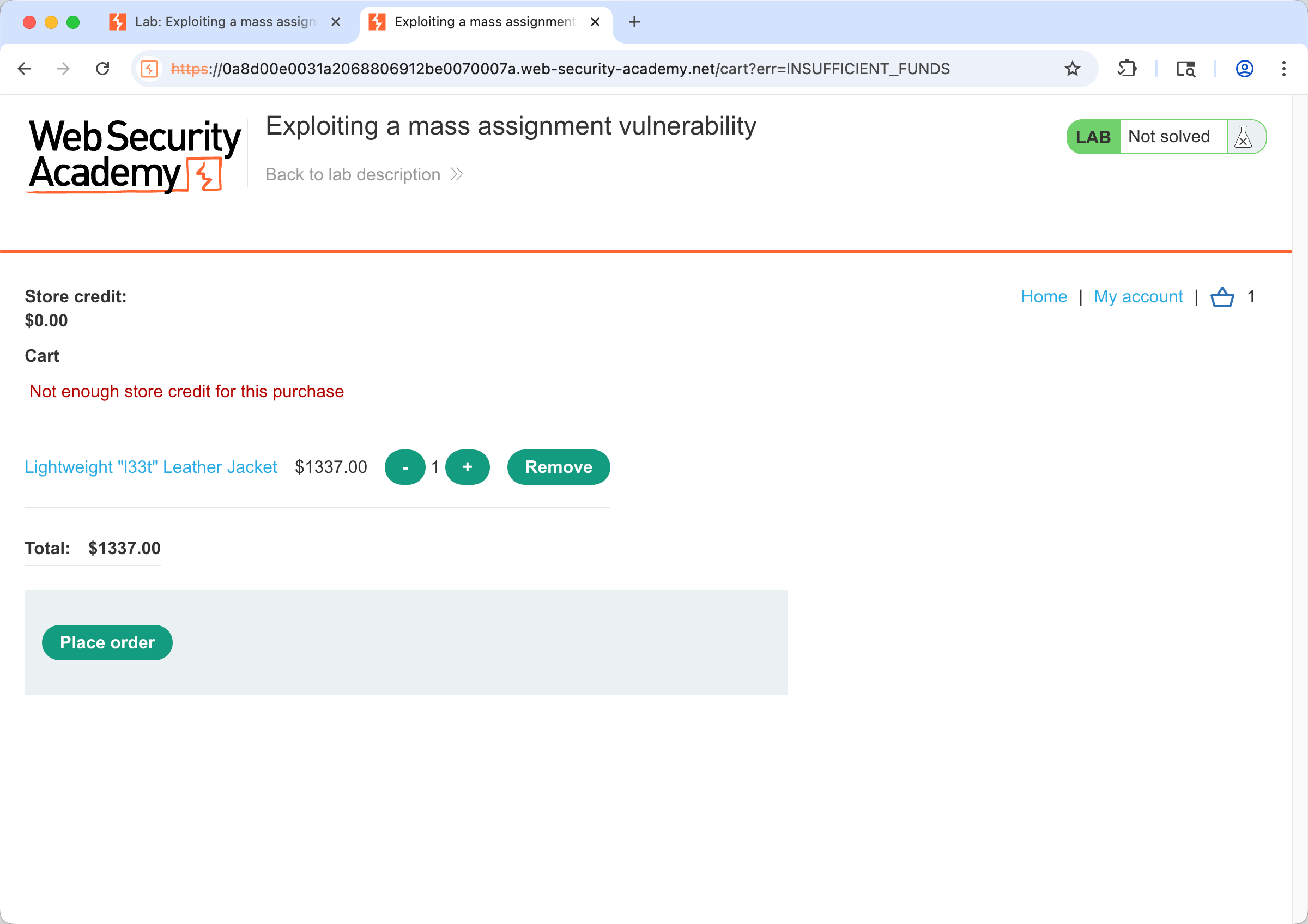 登录。然后找到那件 "Lightweight l33t Leather Jacket",将它加入购物车,并尝试"Place order"(下单)。你会发现因为信用额度不足,购买失败。这是我们预期要解决的问题
