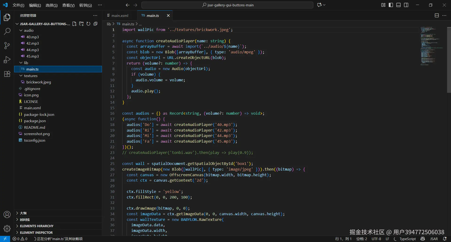 获取 ID 为 gui 的 3D 平面对象,其 shadowRoot 作为 GUI 容器;选中所有 sub 类元素对应 DoRi 等,设置尺寸背景色等样式形成按钮;绑定事件:鼠标进入变深紫、离开恢复深灰、点击时暂变深色并按文本从 audios 取对应函数播放音频音量 1.0;调用 spatialDocumentwatchInputEvent 监听空间输入,确保 3D 场景鼠标交互生效