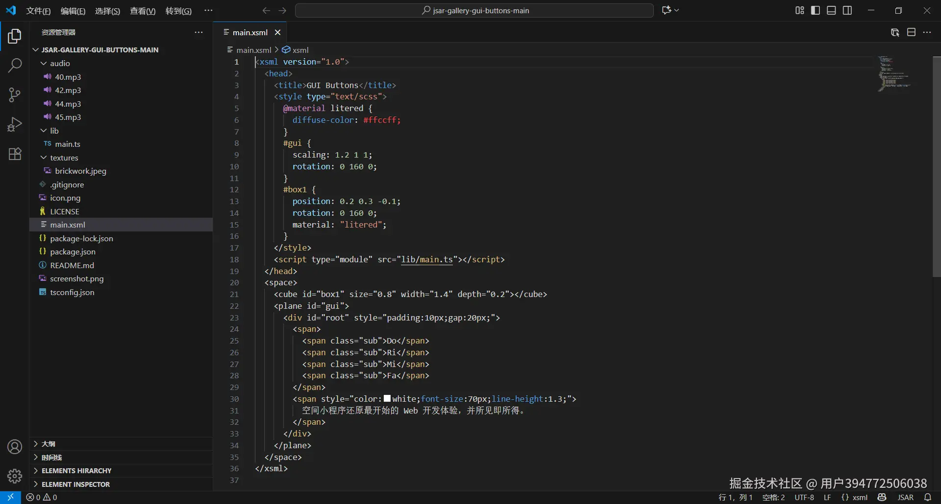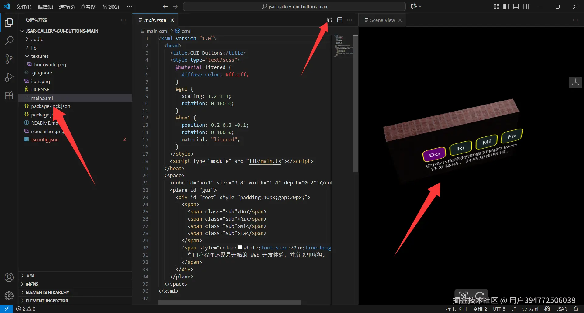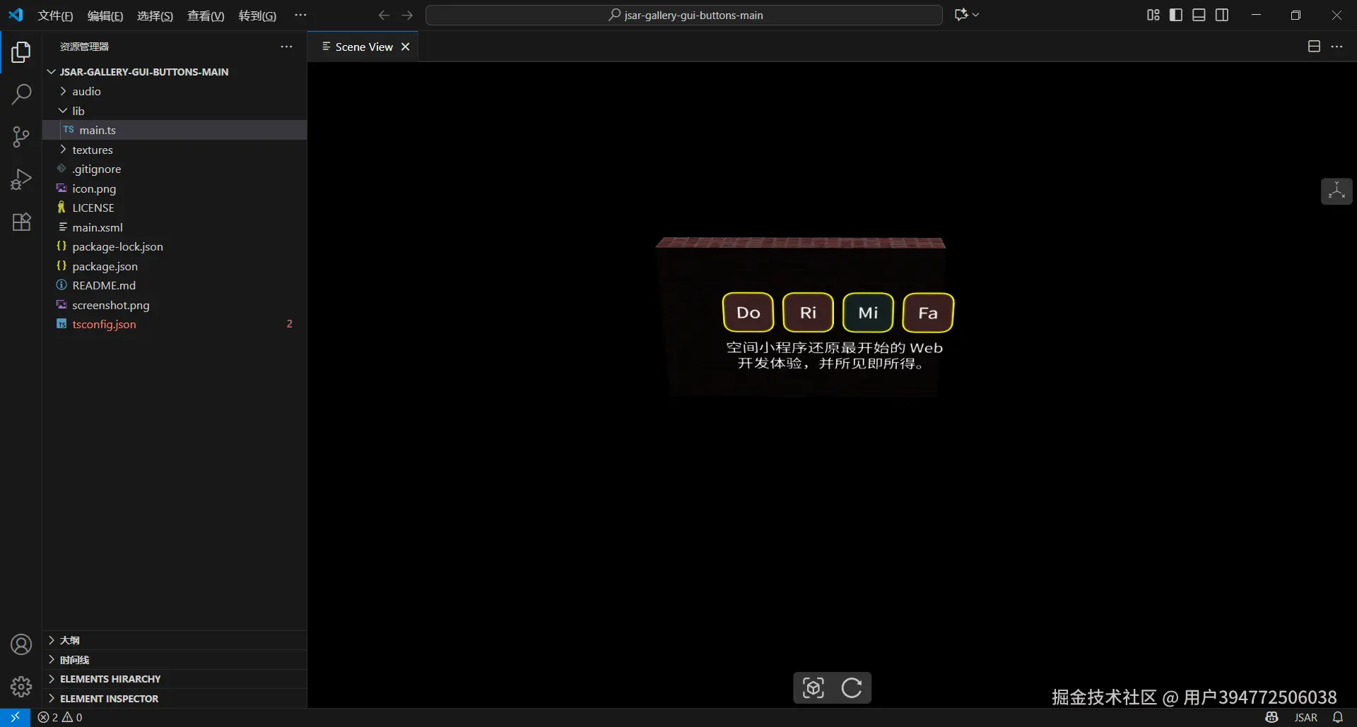 plane 标签创建的元素 id=gui,与头部样式中的 #gui 关联,会应用缩放和旋转配置,成为 3D 空间中承载 GUI 的 "面板";内部的 div id=root 是 GUI 的容器,用内联样式(padding:10px、gap:20px)控制内部元素的间距;两个 span 分别承载:4 个带 class="sub" 的音阶文本;白色大字体的说明文字,直接点明项目核心 ,还原 Web 开发体验,所见即所得