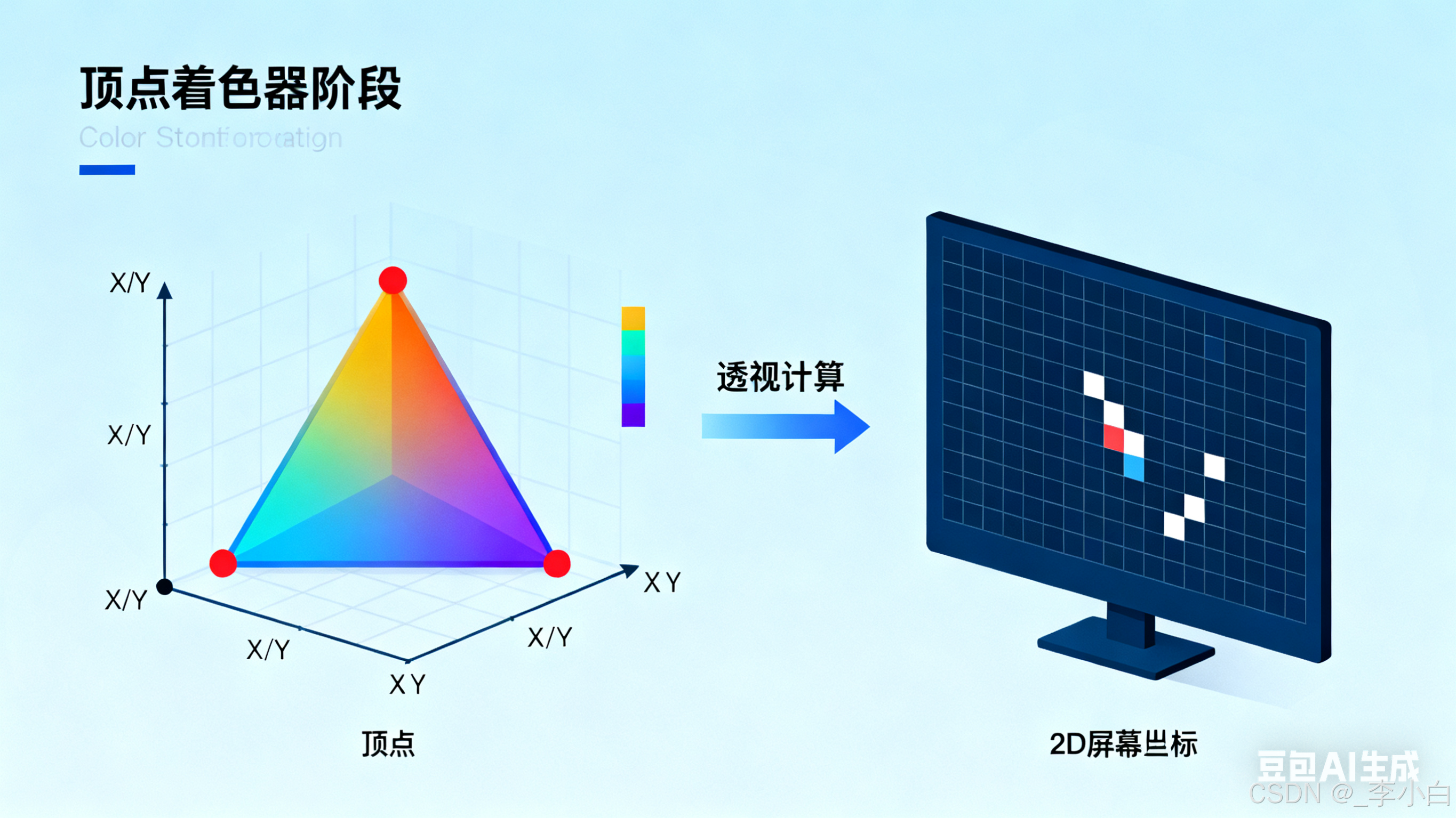 同时,它还能给顶点"打标记":比如这个顶点的颜色是红色,那个是蓝色,后续步骤会根据这些标记给像素上色。