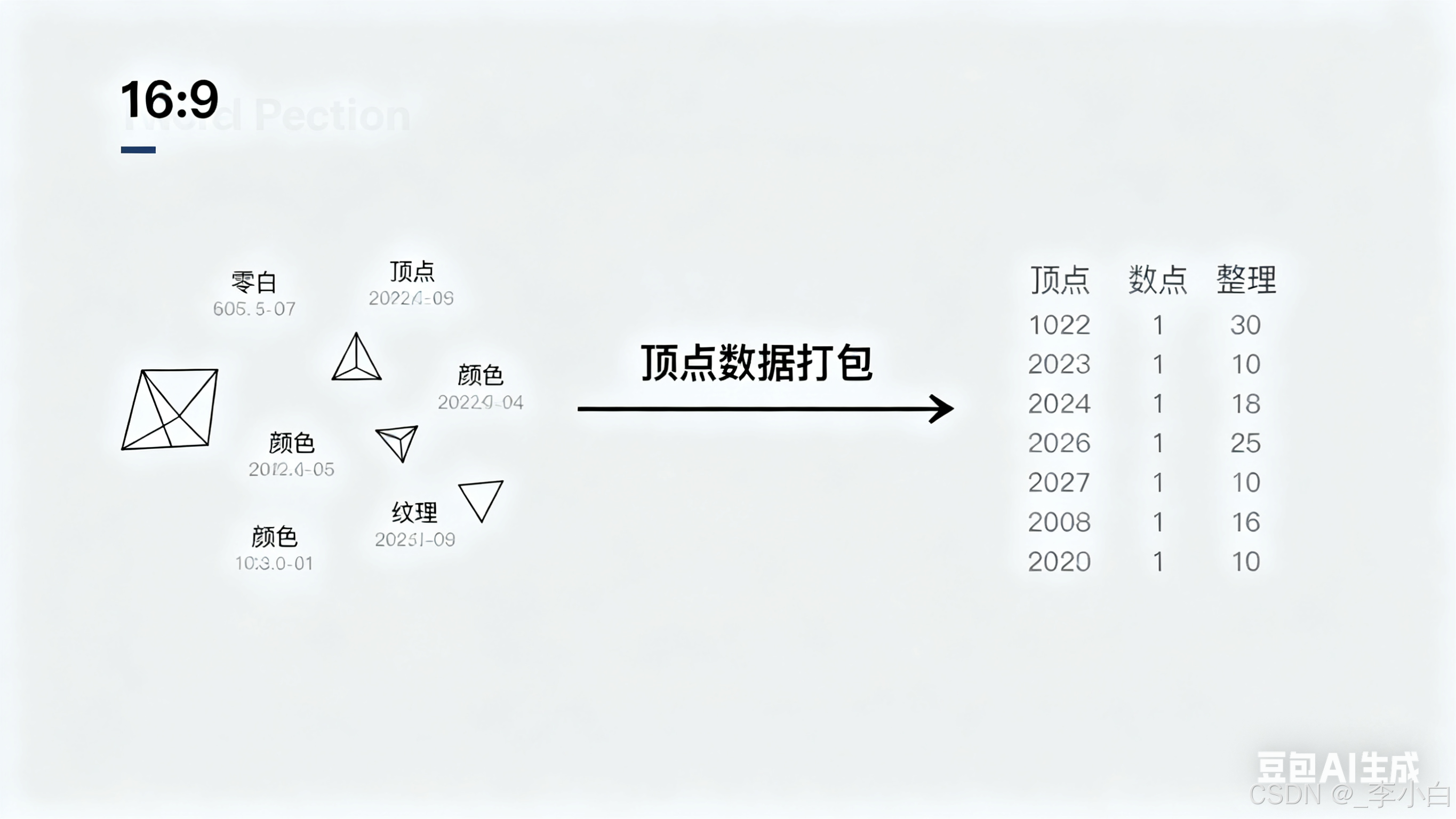 咱们画一个3D物体(比如一个三角形),首先得告诉电脑"这个三角形的3个顶点在哪""每个顶点是什么颜色""要不要贴纹理(图片)"------这些零散的信息就是"顶点数据"(比如顶点位置坐标、顶点颜色、纹理坐标等)。