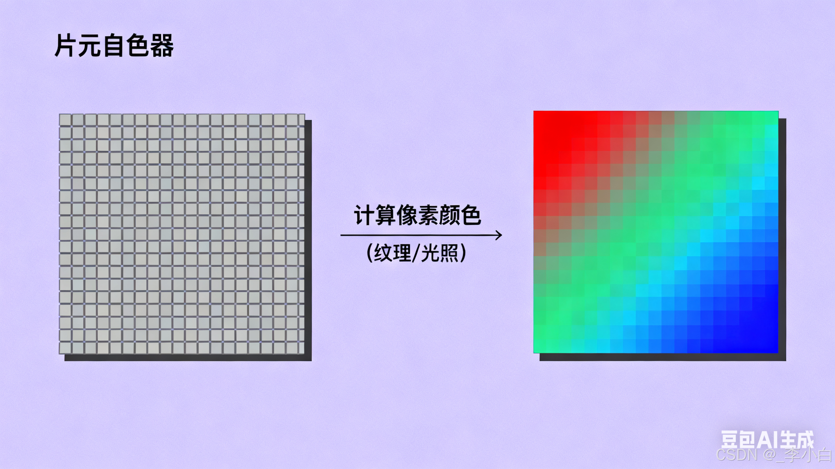 作用 :给每个片元(像素)计算最终的颜色,是第二个可编程阶段 (开发者能灵活控制颜色逻辑)。