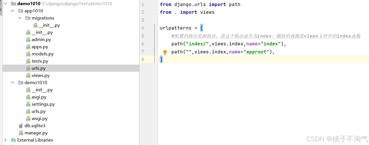 #path参数是url地址,view视图,这里地址配的""表明是根路径,视图对应的是views里面的index函数,name是为这个路由命名为index