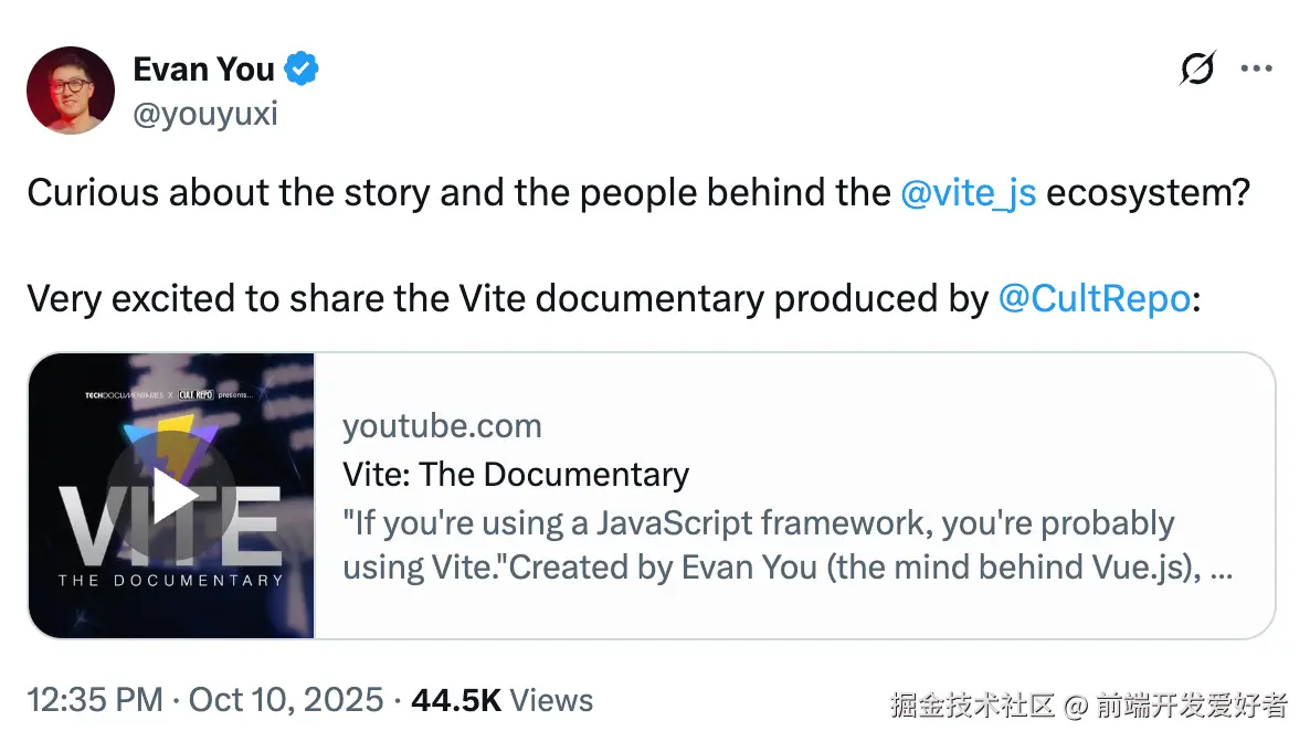 就在昨天,尤雨溪 在推特上宣布:Vite 官方纪录片正式发布!