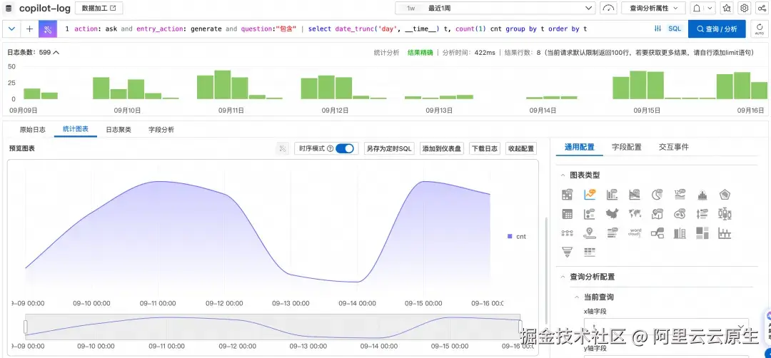 更进一步,我们还可以通过 SQL 针对某种特征数据进行灵活的聚合统计和分析,如下例:我们按天统计用户提问中有"包含"字眼的请求趋势变化。
