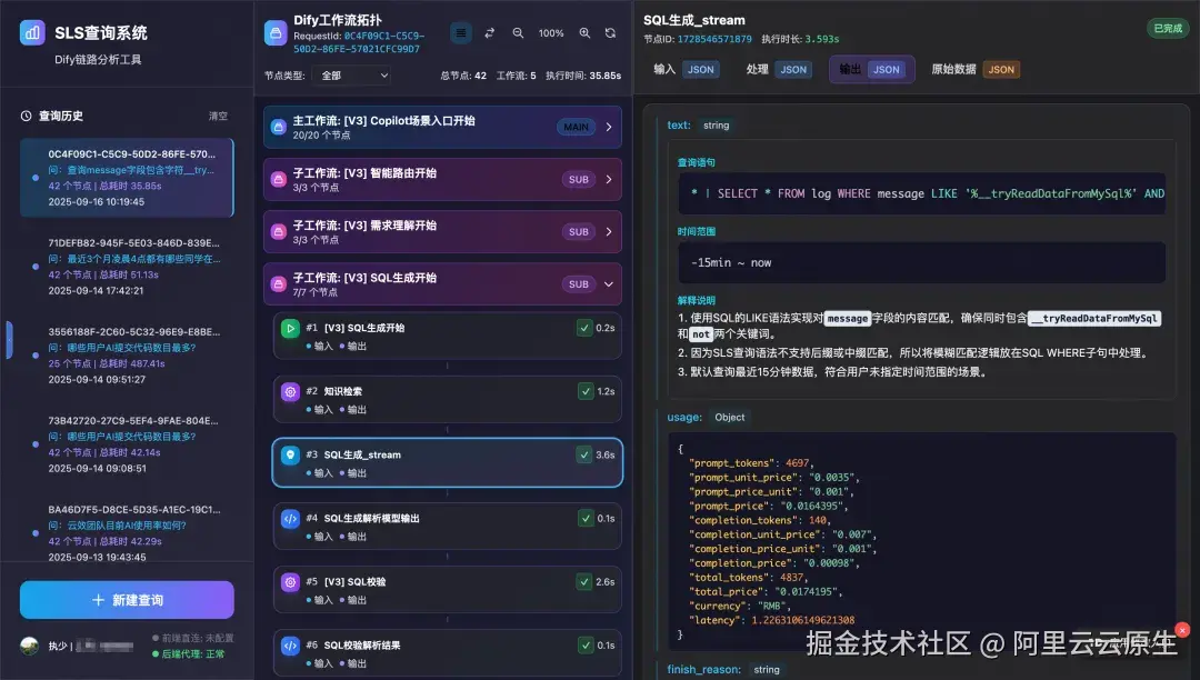 案例:当用户提交 SQL 生成请求时,系统会依次执行会话记忆→智能路由→需求理解→SQL 生成→语法校验等多个步骤。若最终结果不符合预期,我们需要逐个检查每个步骤的详细执行过程以定位具体原因,尤其是当问题复杂时,需要多次切换上下文,整个排查过程往往需要 30 分钟以上。