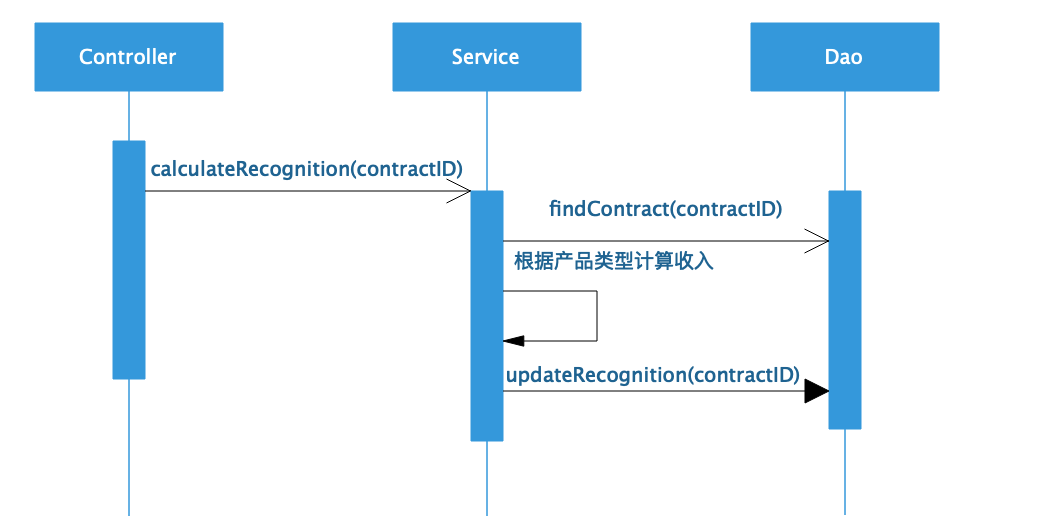 用户发起请求到Controller,Controller调用Service的calculateRecognition方法,并将合同ID传递过去计算确认收入。Service根据合同ID调用Dao查找合同信息,根据合同获得产品类型,再根据产品类型计算收入,然后把确认收入保存到数据库。