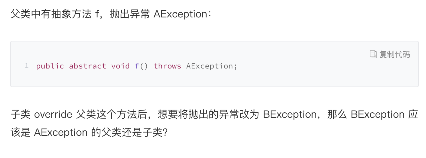 的子类。因为只有异常是子类,使用父类的地方catch异常的时候,才能catch到子类异常,也就是才满足里氏替换原则,能用子类替换父类。
