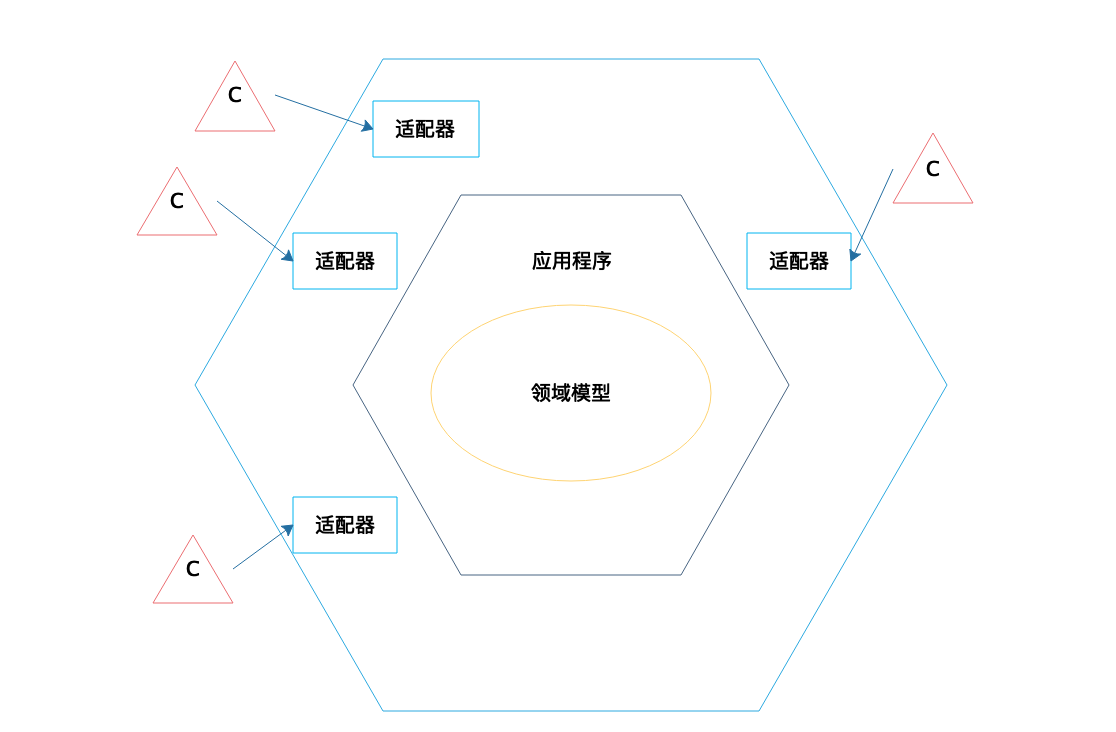 六边形架构是DDD中比较知名的一种架构方式,领域模型通过应用程序封装成一个相对比较独立的模块,而不同的外部系统则通过不同的适配器和领域模型交互,比如可以通过HTTP接口访问领域模型,也可以通过Web Service或者消息队列访问领域模型,只需要为这些不同的访问接口提供不同的适配器就可以了。