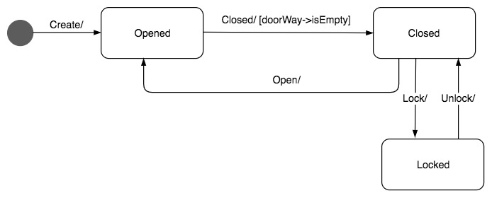 UML的状态图可以很好地解决这一问题,一张状态图描述一个对象生命周期的各种状态,及其变迁的关系。如图所示,门的状态有开opened、关closed和锁locked三种,状态与变迁关系用一张状态图就可以搞定。