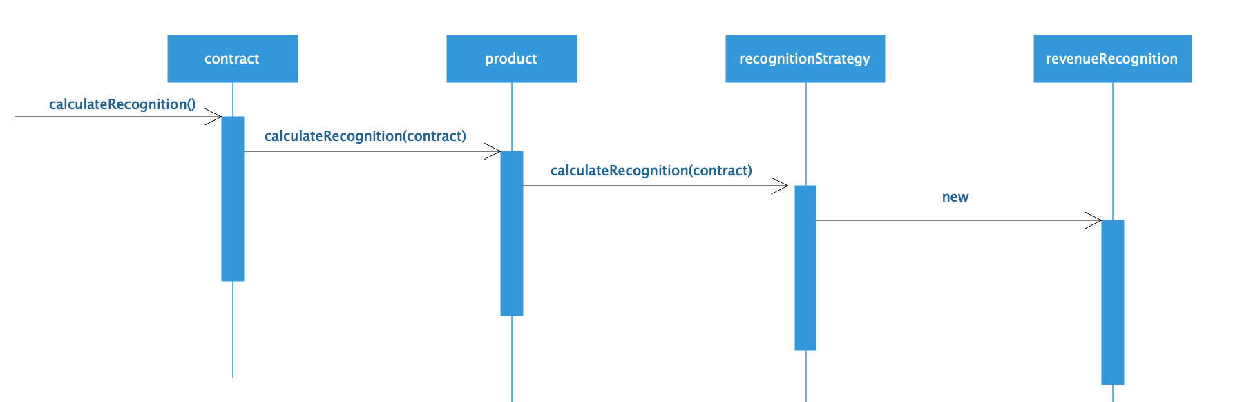 计算收入的请求直接提交给合同对象Contract,这个时候,就无需传递合同ID,因为请求的合同对象就是这个ID的对象。合同对象聚合了一个产品对Product,并调用这个product的calculateRecognition方法,把合同对象传递过去。不同产品关联不同的收入确认策略recognitionStrategy,调用recognitionStrategy的calculateRecognition,完成收入对象revenueRecognition的创建,也就完成了收入计算。