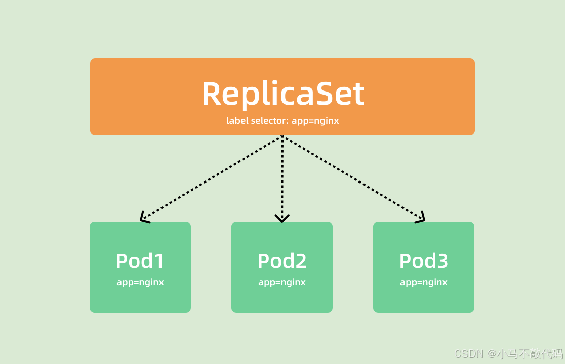 上面就是我们定义的一个普通的 ReplicaSet 资源清单文件,ReplicaSet 控制器会通过定义的 Label Selector 标签去查找集群中的 Pod 对象: