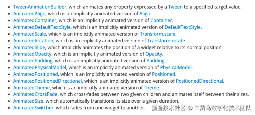 通过使用 Flutter 的 动画库,你可以为 UI 中的组件添加运动和创建视觉效果。你可以使用库中的一套组件来管理动画,这些组件统称为隐式动画 或隐式动画组件 ,其名称源于它们都实现了 ImplicitlyAnimatedWidget 类。使用隐式动画,你可以通过设置一个目标值,驱动 widget 的属性进行动画变换;每当目标值发生变化时,属性会从旧值逐渐更新到新值。通过这种方式,隐式动画内部实现了动画控制,从而能够方便地使用--- 隐式动画组件会管理动画效果,用户不需要再进行额外的处理。