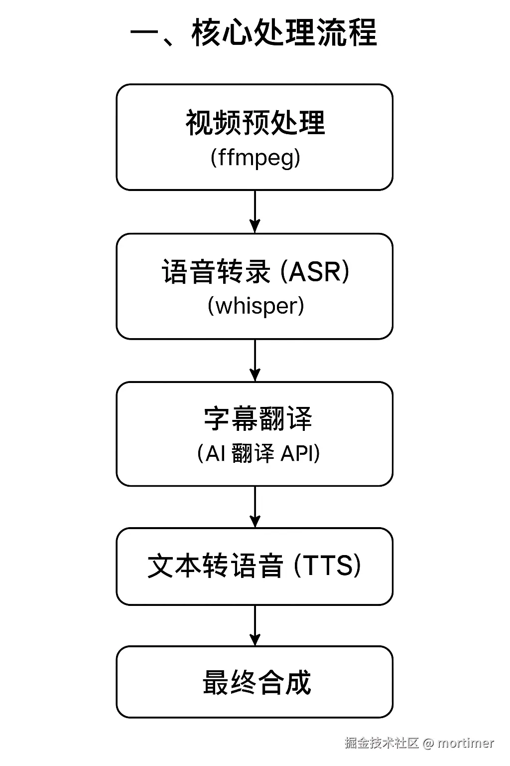 软件的核心功能是将一个视频自动翻译并配上目标语言的语音。整个过程被分解为一系列独立的步骤,形成一条自动化的处理流水线: