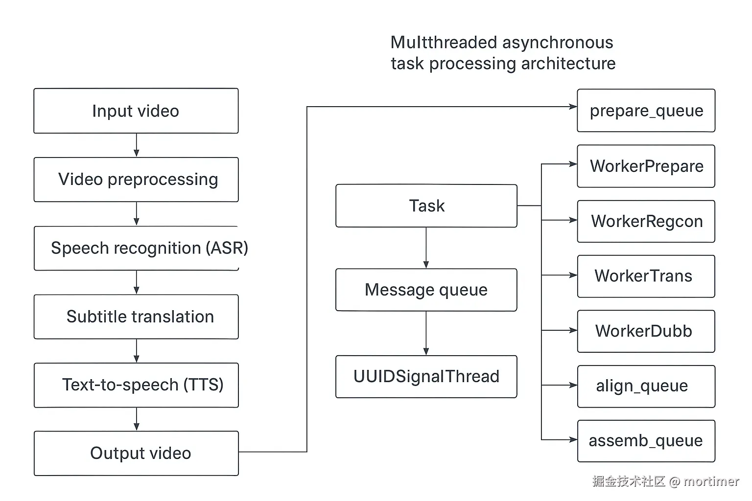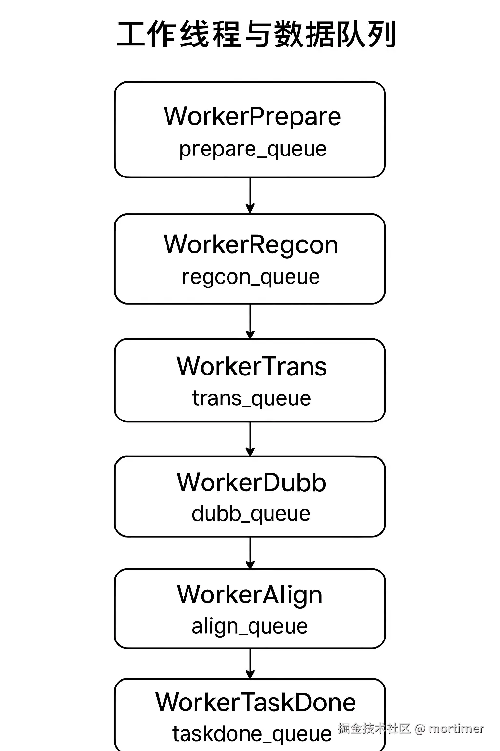 当用户发起一个任务(例如翻译一个视频)时,该任务会依次流经一个由 7 个专用工作线程组成的流水线。每个线程负责处理流程中的一个特定阶段,并通过队列(Queue)与下一个线程进行数据交接。