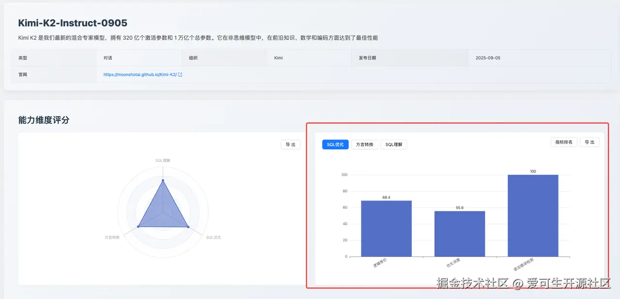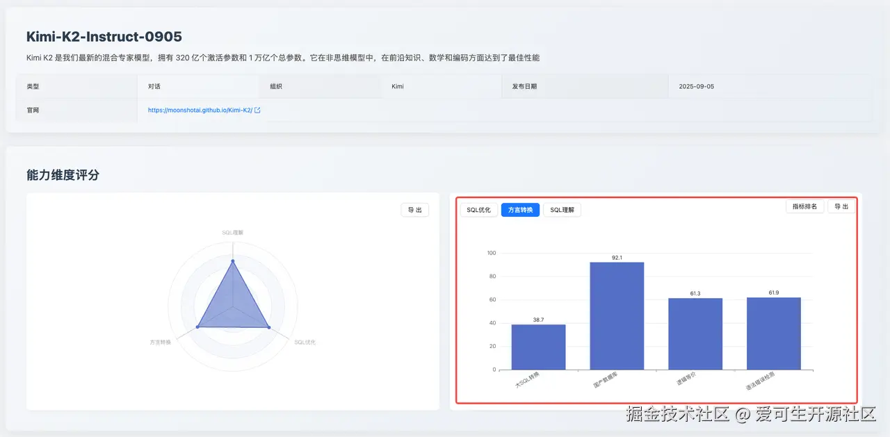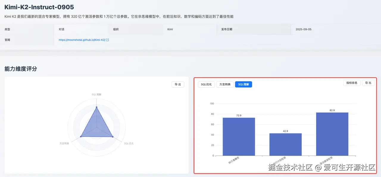 - 新增模型评测 :新增的 Kimi K2 模型在「SQL 理解 」维度获得 70.4 分,「SQL 优化 」维度获得 64.4 分,「方言转换 」维度获得 63.0分。评测结果显示,该模型在国产数据库适配和基础语法处理方面表现突出,但在处理超长复杂查询和深度优化方面与领先模型存在差距。