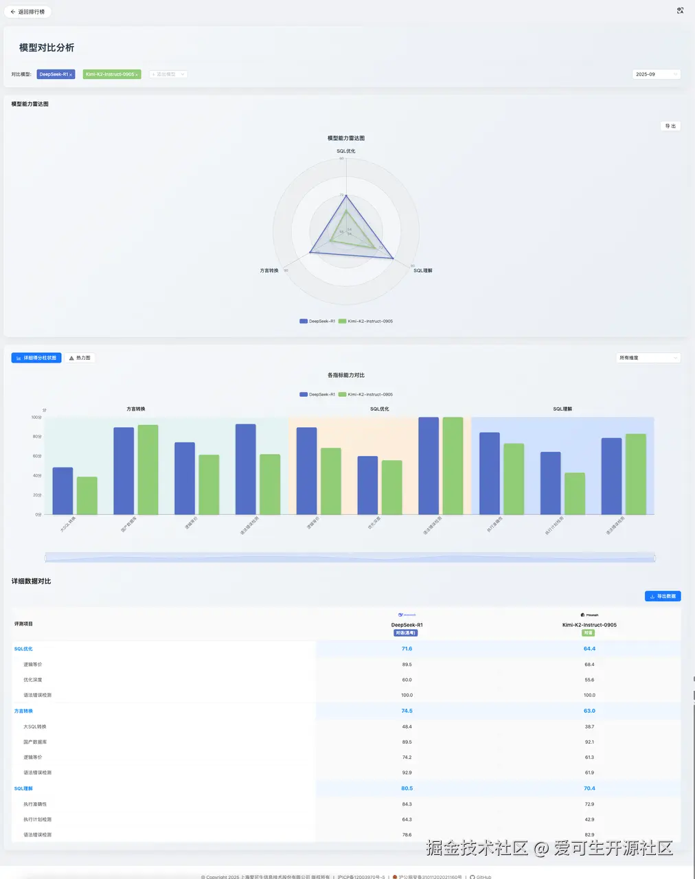 应用举例 :假设一个团队需要在"支持国产数据库 "和"处理复杂查询迁移 "两个能力中做出选择。通过模型对比功能,将 Kimi K2 与 DeepSeek-R1 并列比较,数据将清晰呈现:Kimi K2 在「国产数据库 」转换上优势明显,但在「大 SQL 转换」上远逊于 DeepSeek-R1。这一可视化结果使得决策路径变得清晰:如果核心任务是适配国产数据库,Kimi K2 是更优选择;反之,则应选择后者。该功能将复杂的选型评估,转变为直观的数据比较,极大提升了决策的效率和准确性。