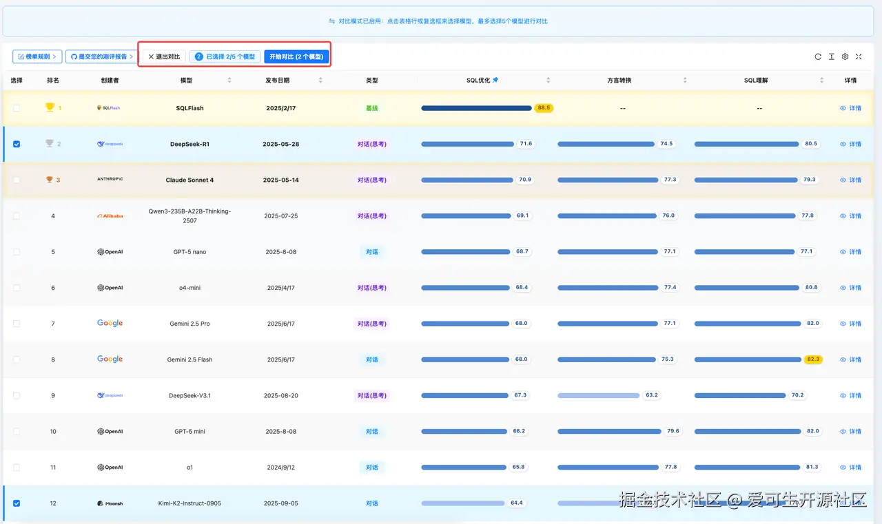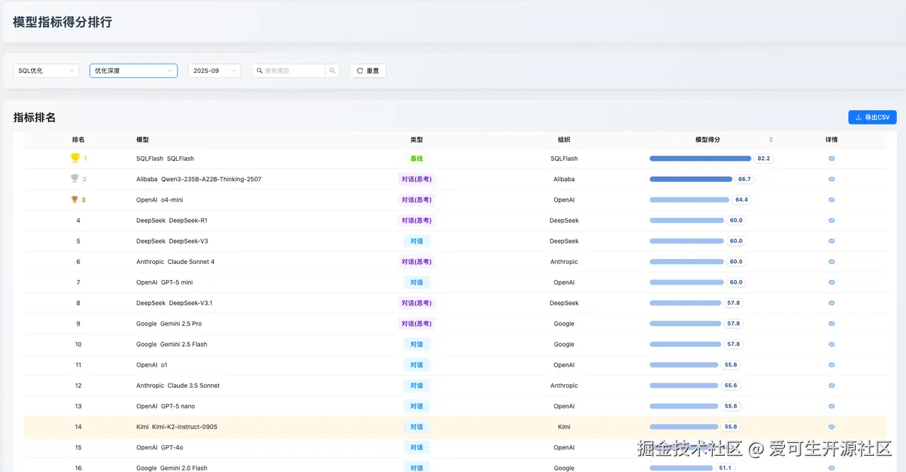 2025 年 9 月,SCALE 评测基准持续聚焦 AI 在 SQL 领域的应用前沿。本月,榜单新增了 Moonshot AI(月之暗面) 发布的最新模型 ------ Kimi-K2-Instruct-0905,还在平台功能上进行了升级,旨在为开发者、研究者和企业决策者提供更精细、更具洞察力的技术参考。